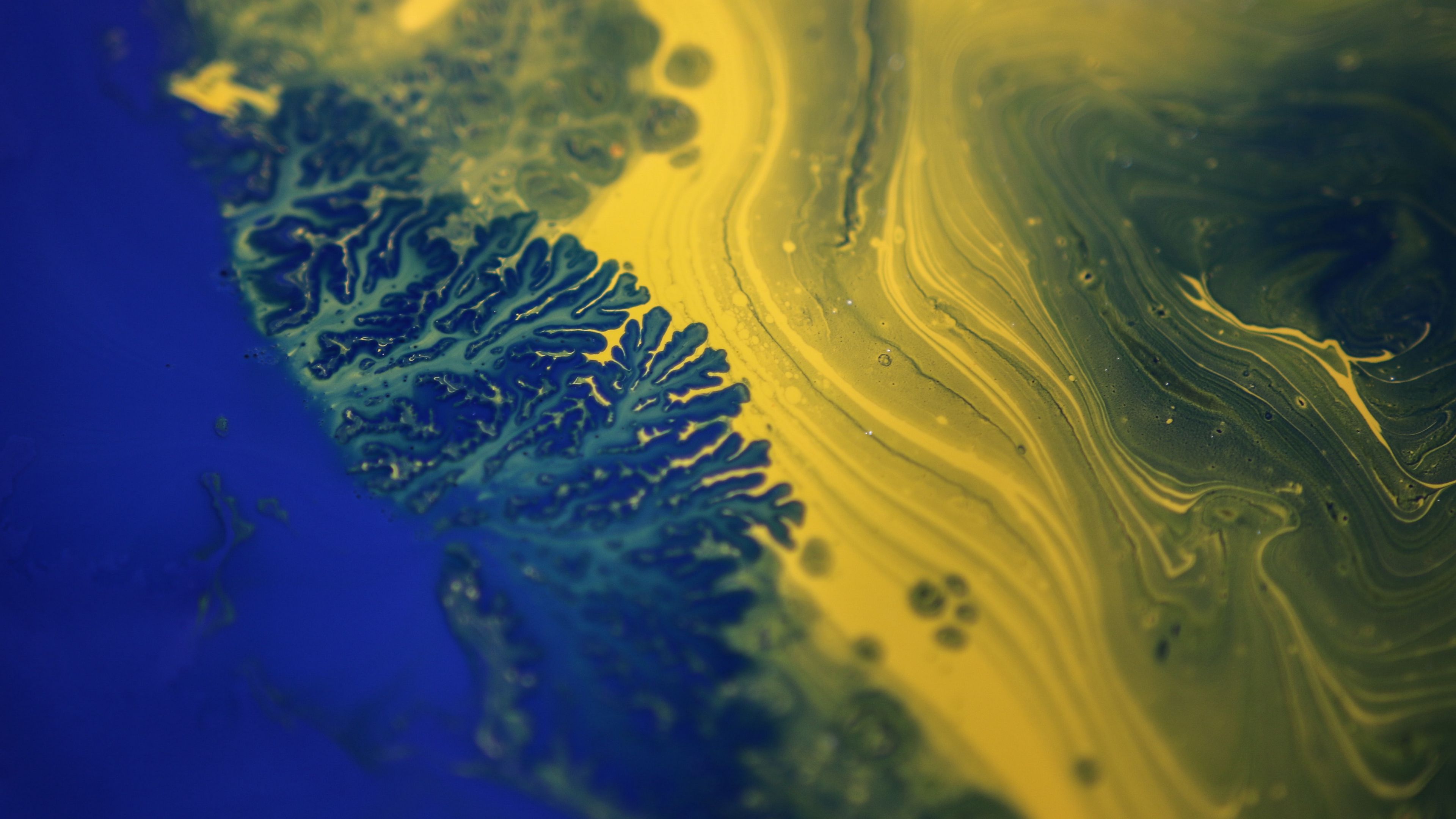 Description: A close up of a yellow and blue painting with a blue background and a yellow strip of paint on the bottom of the painting.
