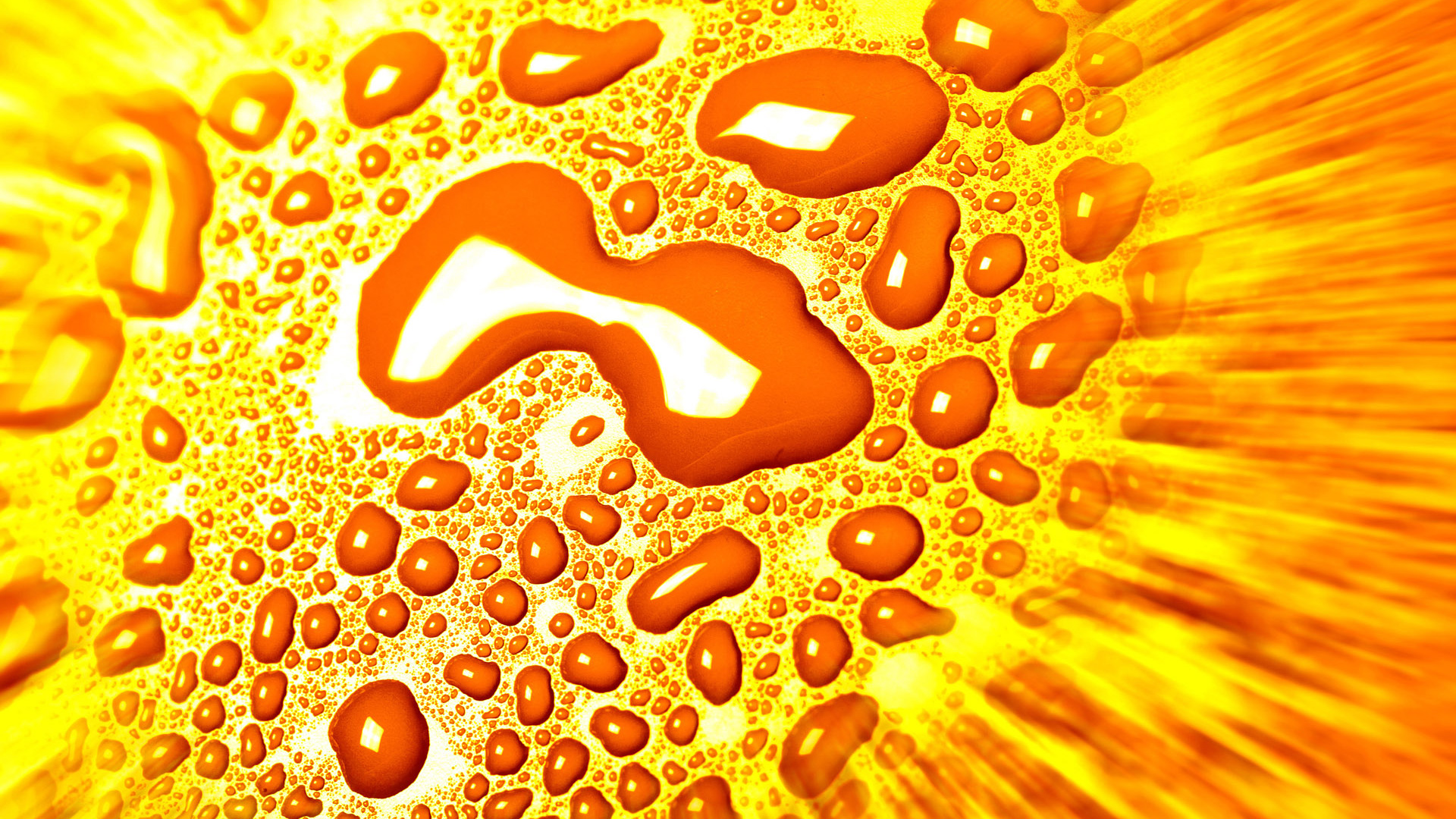 Description: A close up of a yellow liquid with bubbles and drops of water on it.