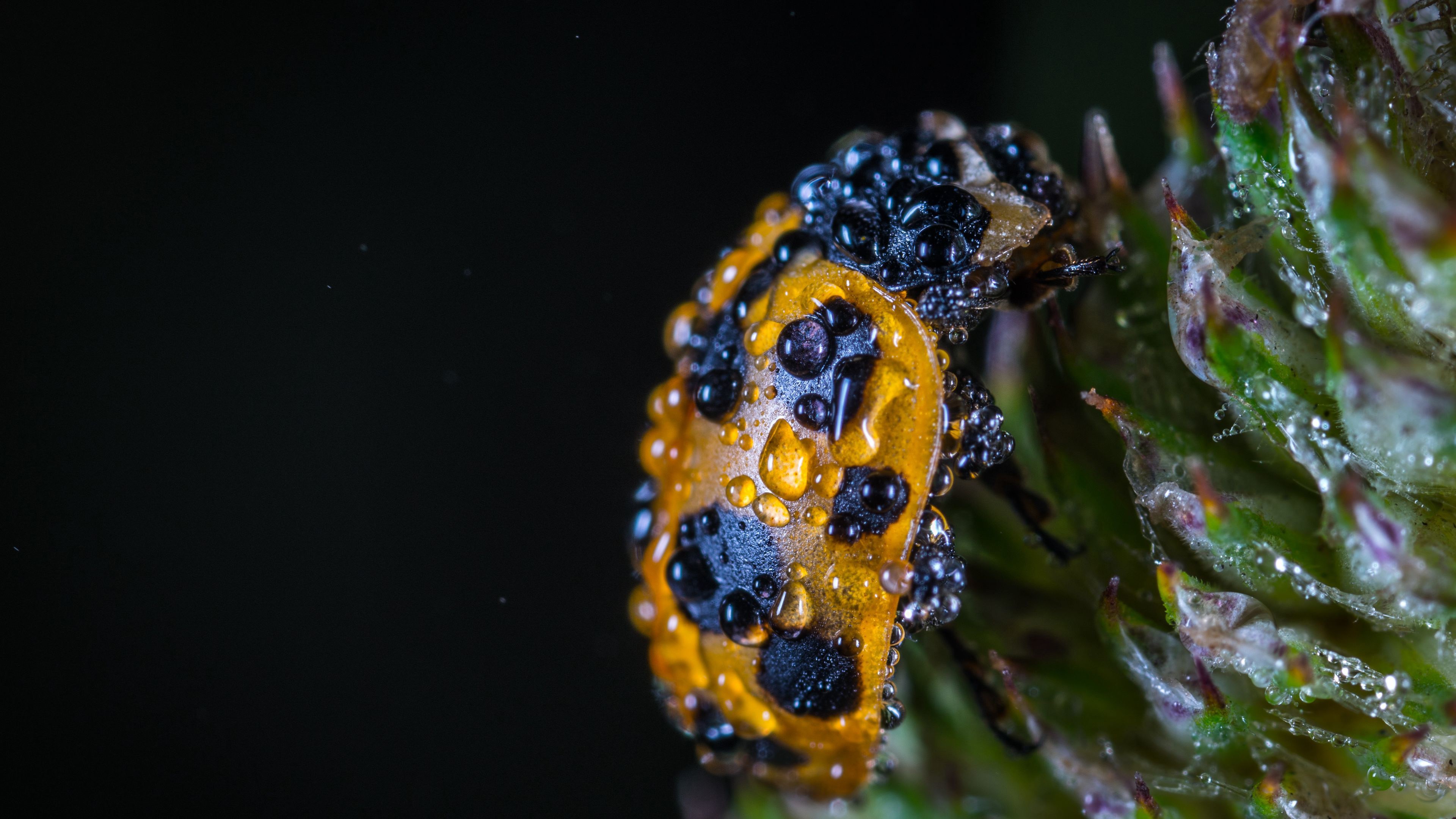 Description: A close up of a yellow and black bug on a plant with drops of water on it's back.
