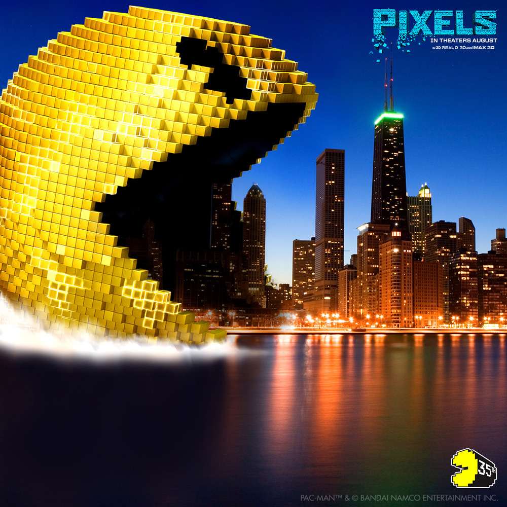 Description: A large yellow building with a giant yellow object in the middle of it's face and a city skyline in the background.