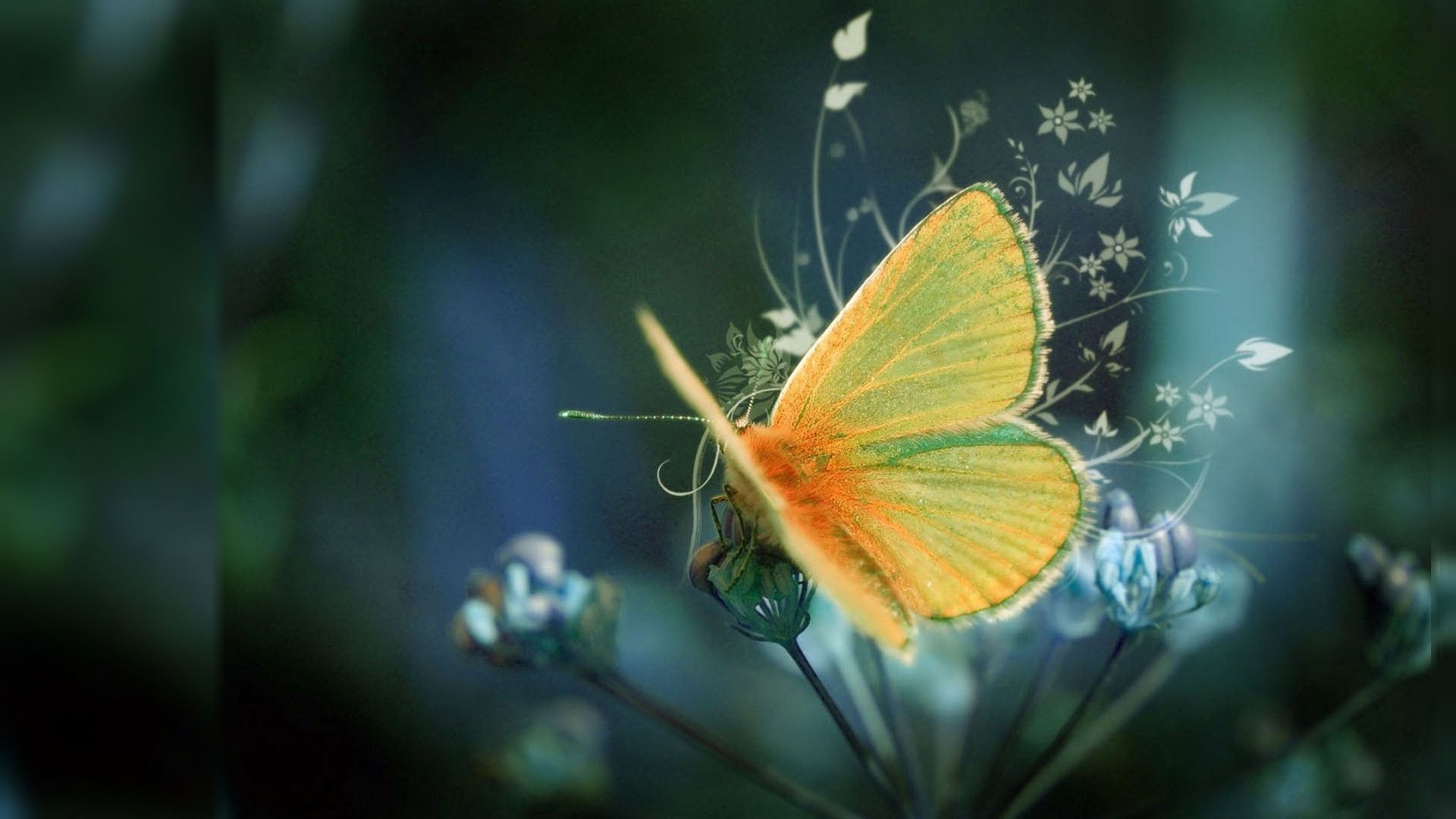 Description: A yellow butterfly sitting on a flower in a blurry photo of a plant with white flowers and leaves.
