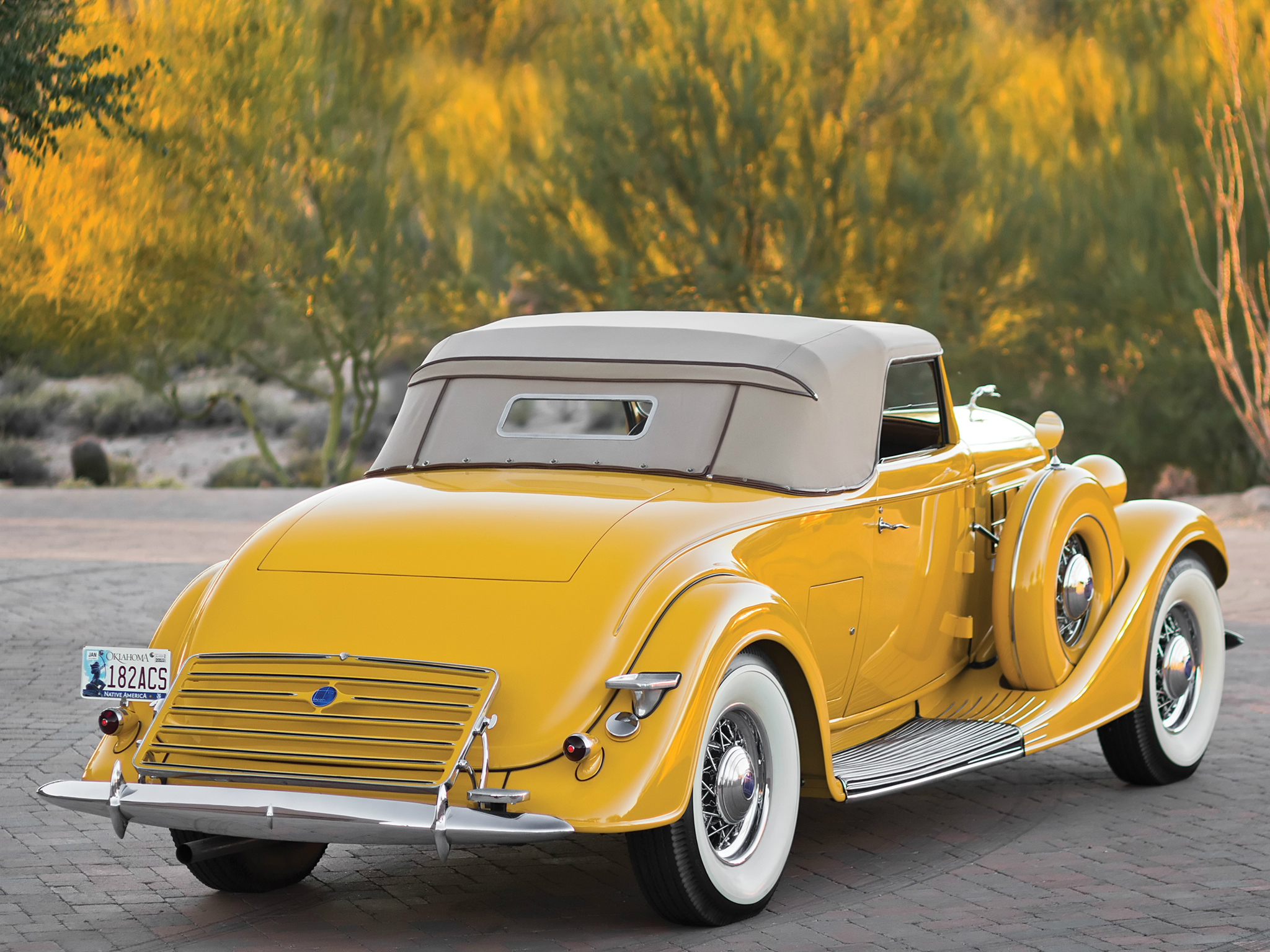 Description: A yellow car parked on a brick road next to a forest of trees and bushes with a white top.
