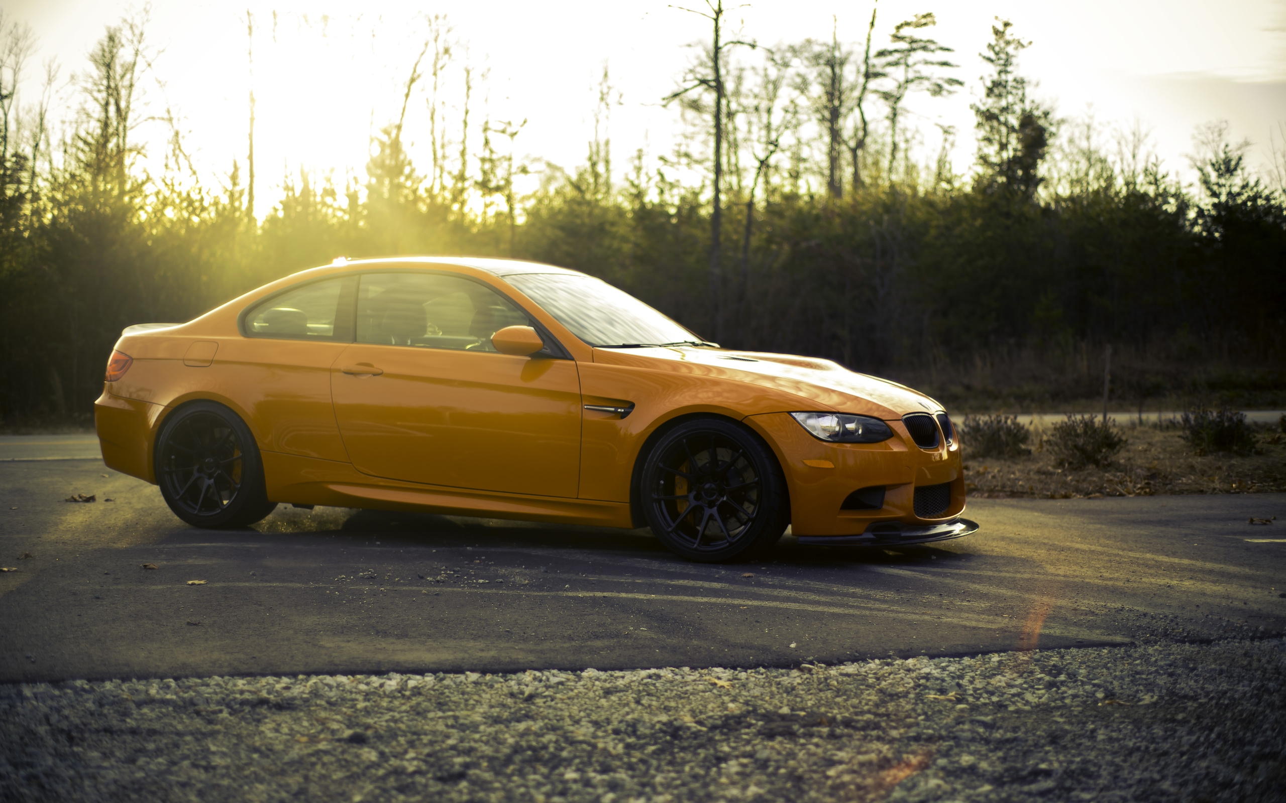 Description: A yellow car parked in a parking lot with the sun shining through the trees behind it and a person standing next to it.