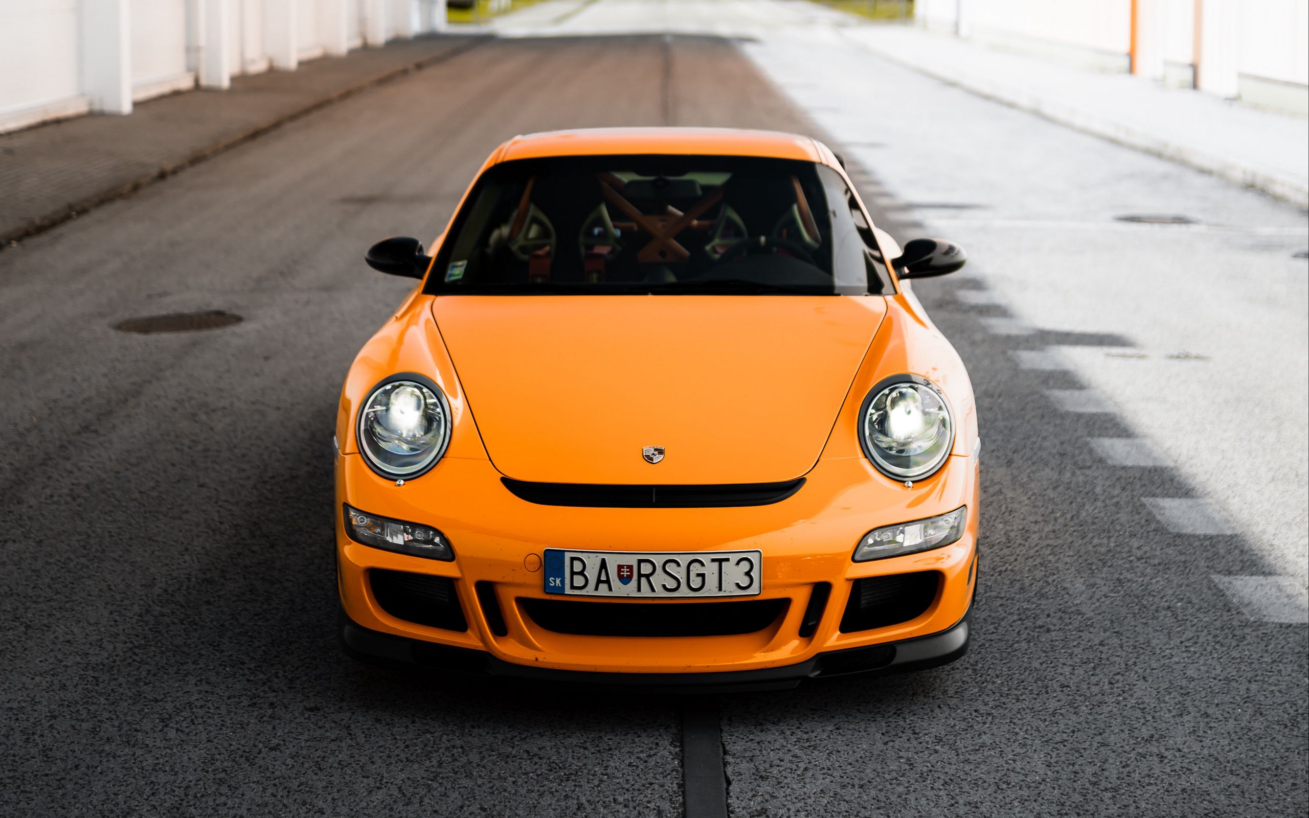 Description: A yellow car driving down a street next to a white building with a sign on it's side.