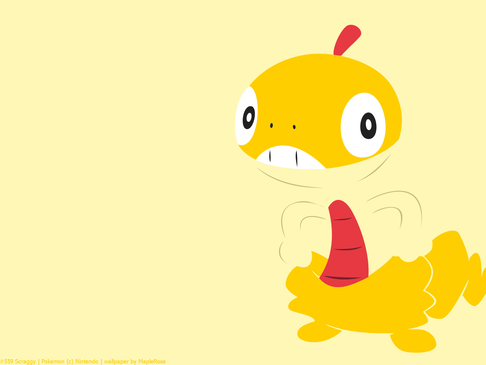Description: A yellow cartoon character with a red nose and a worm like body sitting on the ground with its mouth open.