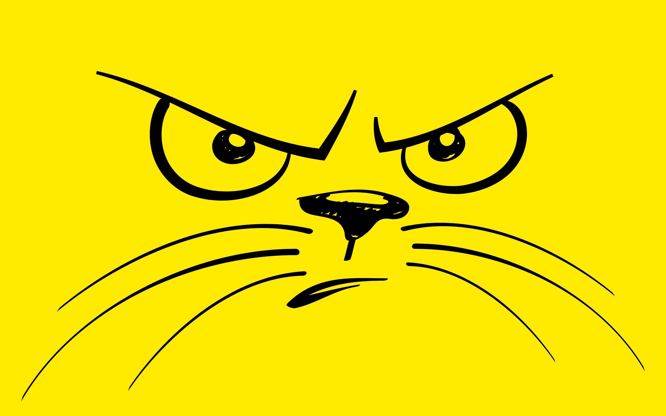 Description: A yellow background with a black cat's face drawn in black ink with a yellow background and a black cat's face drawn in black ink.