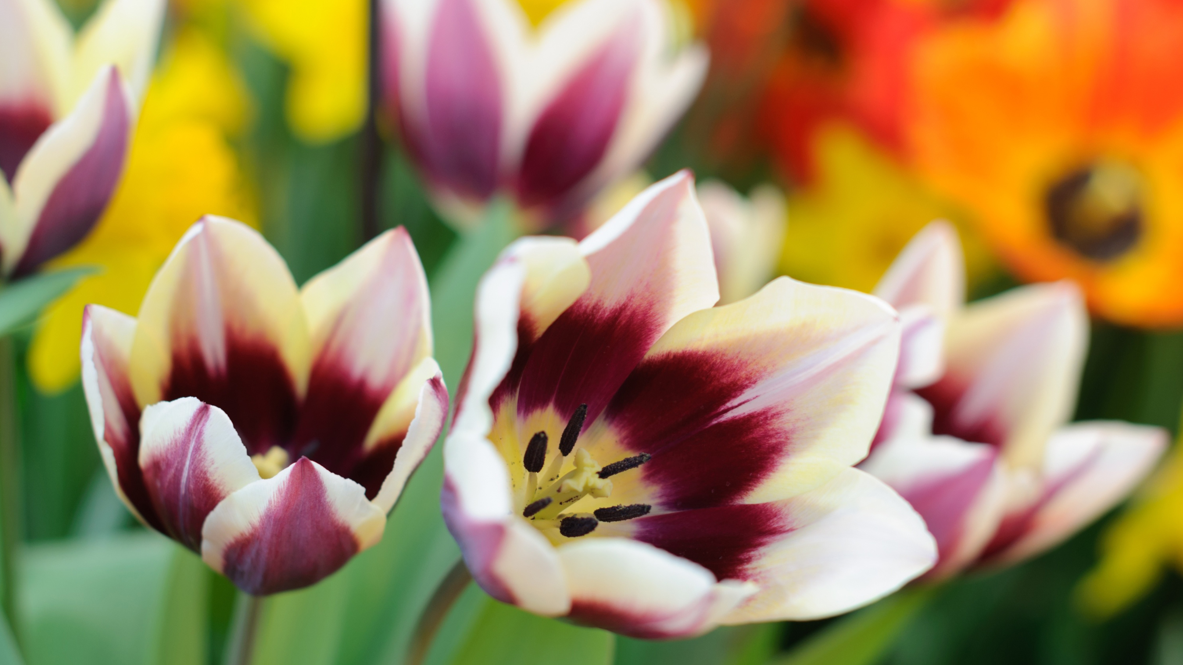 Description: A close up of a bunch of flowers with many colors in the background and a yellow one in the middle.