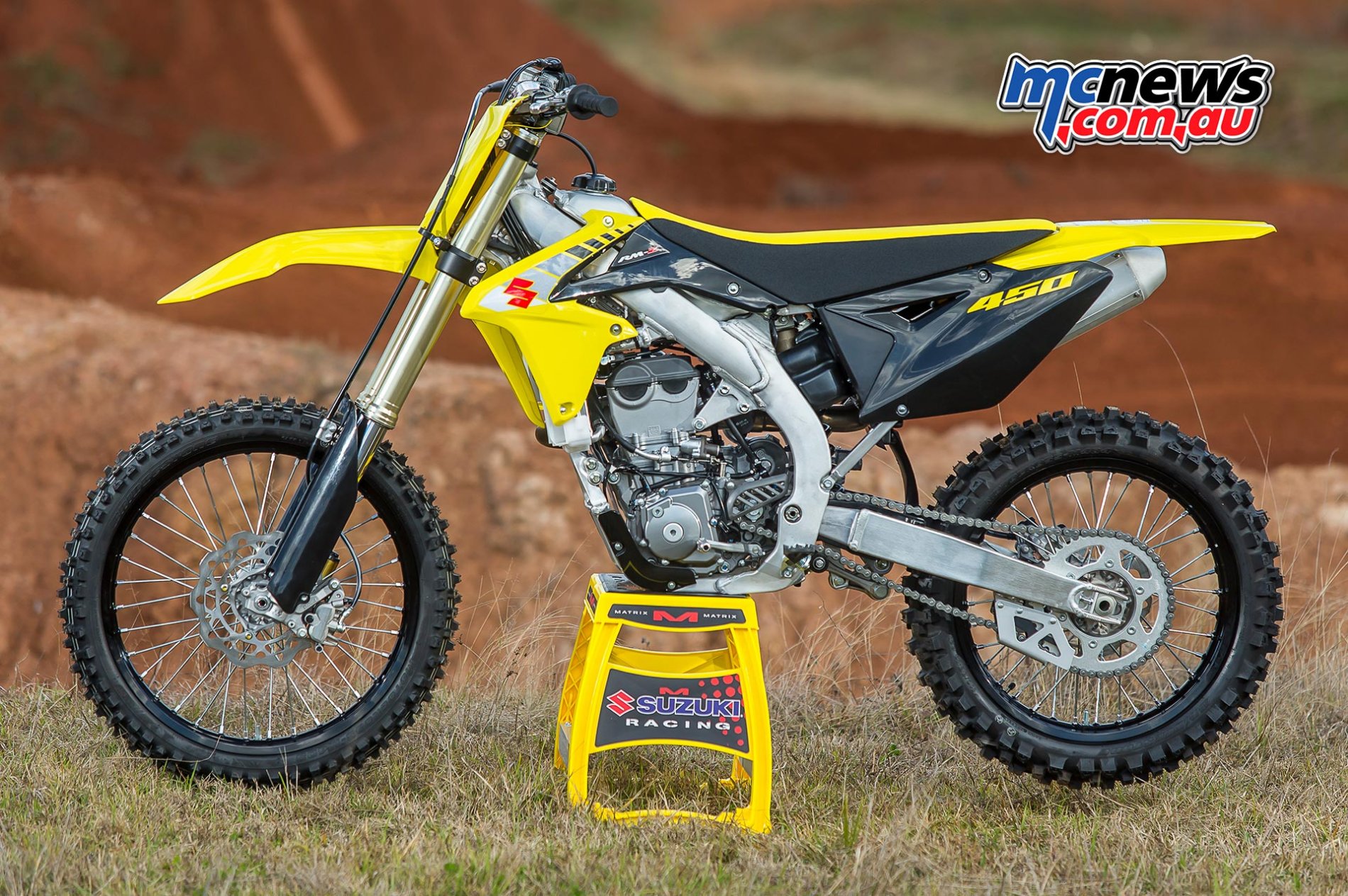 Description: A yellow dirt bike parked on top of a yellow stand in a field of grass and dirt with a red hill in the background.