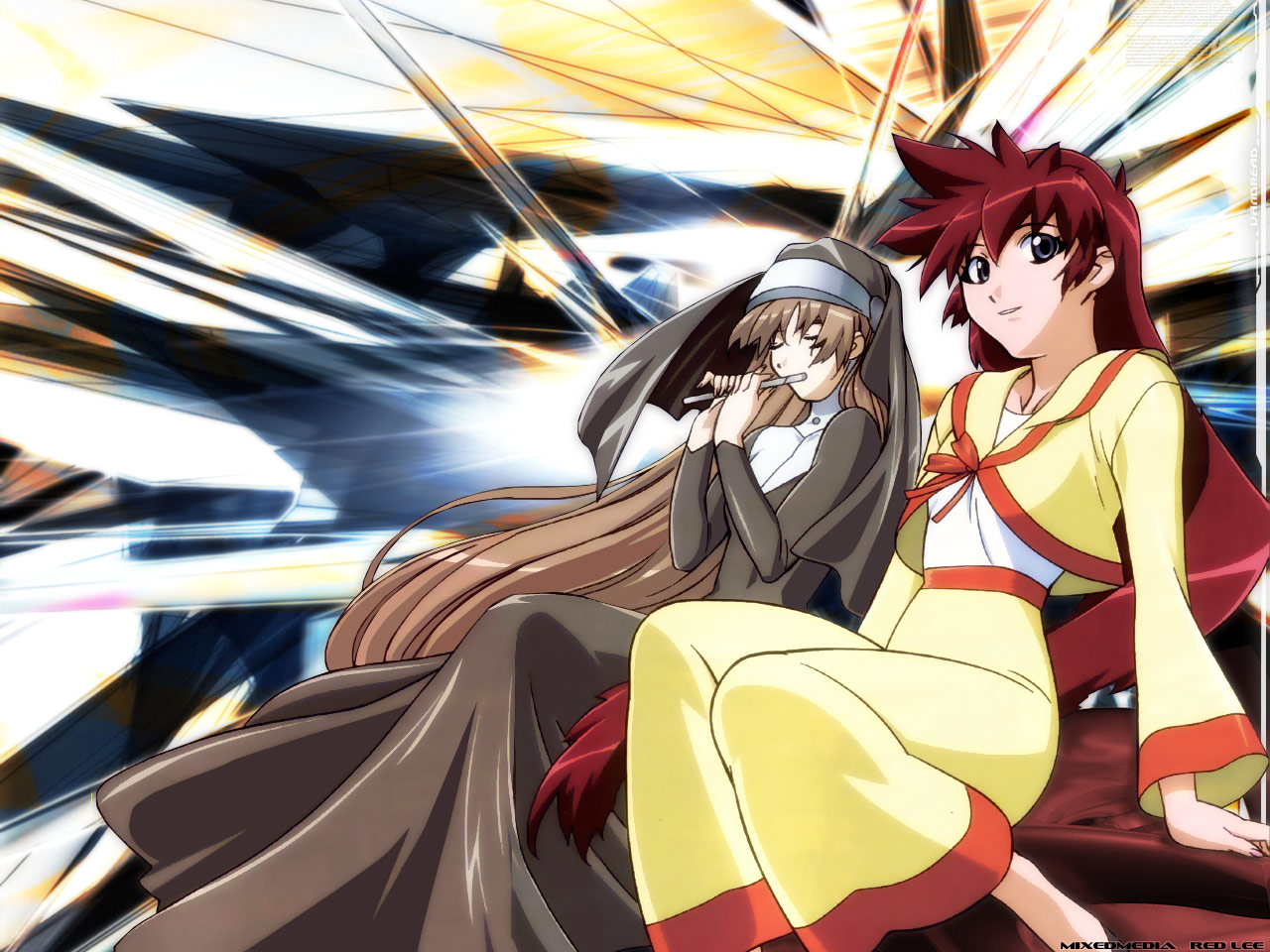 Description: A woman in a yellow dress sitting next to a man in a red and yellow dress and a black and white background.