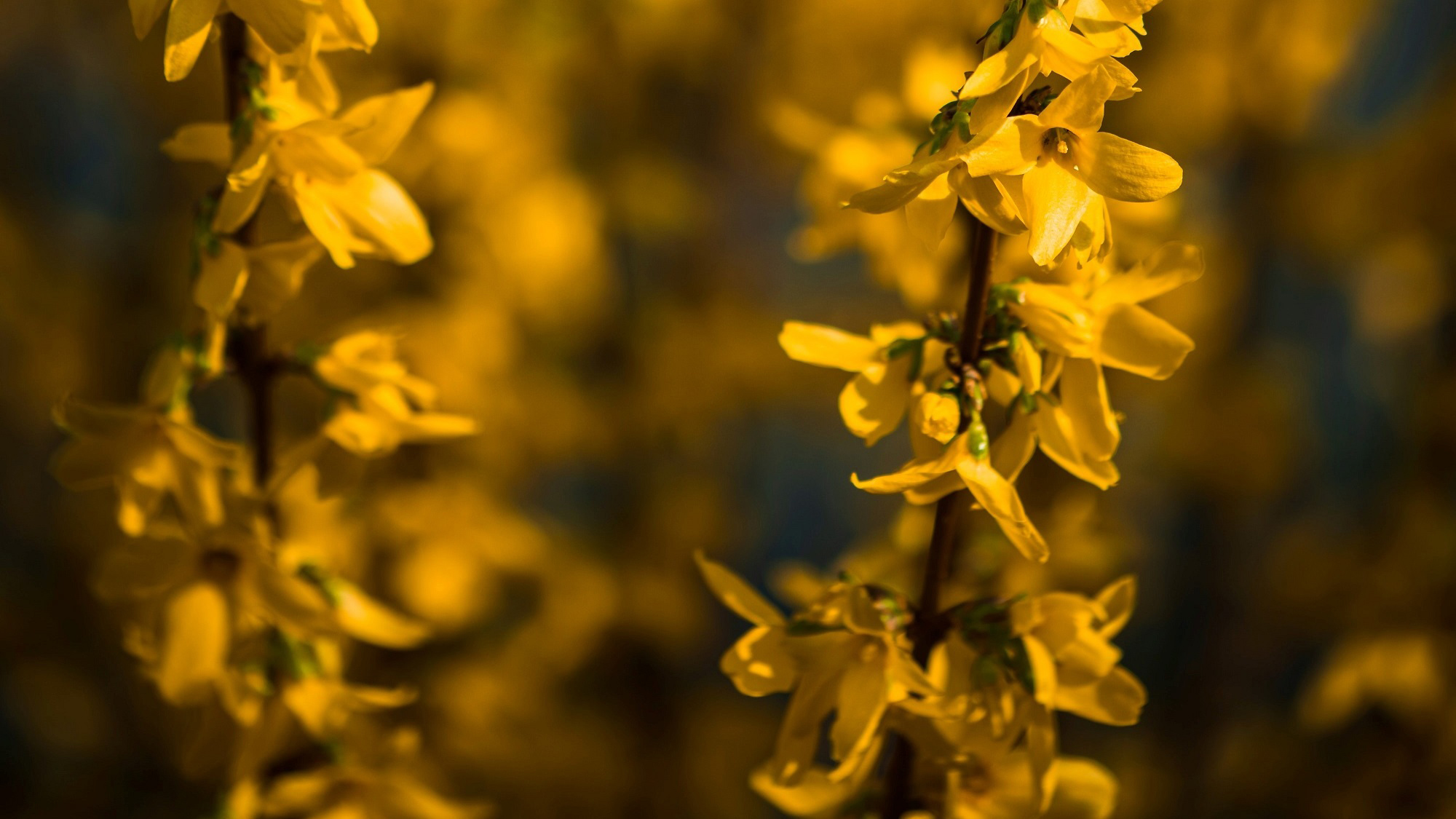 Description: A close up of a bunch of yellow flowers with a blue background and a blurry background of yellow flowers.