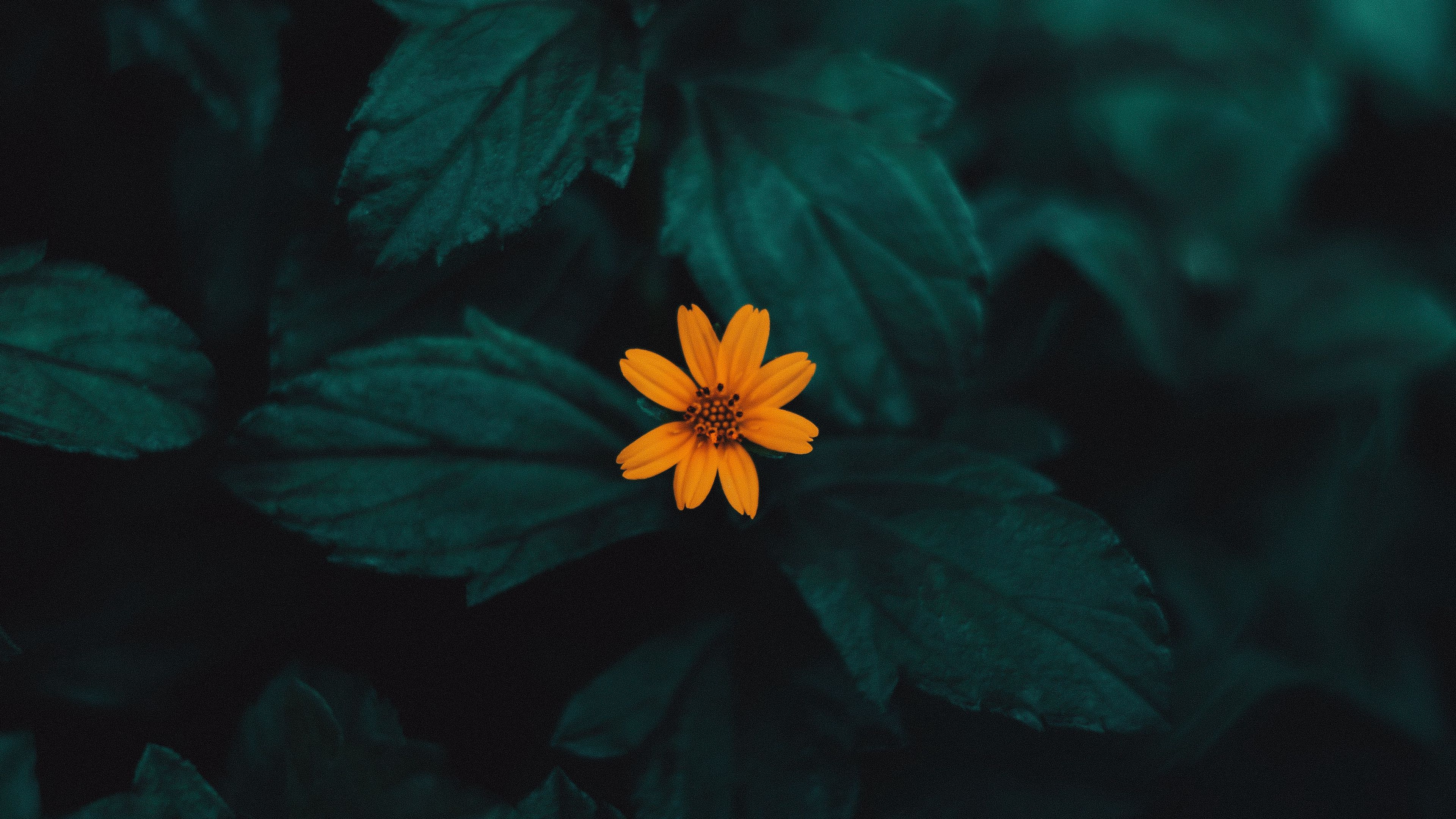 Description: A yellow flower with green leaves in the background and a dark green background with a yellow center and a black center.