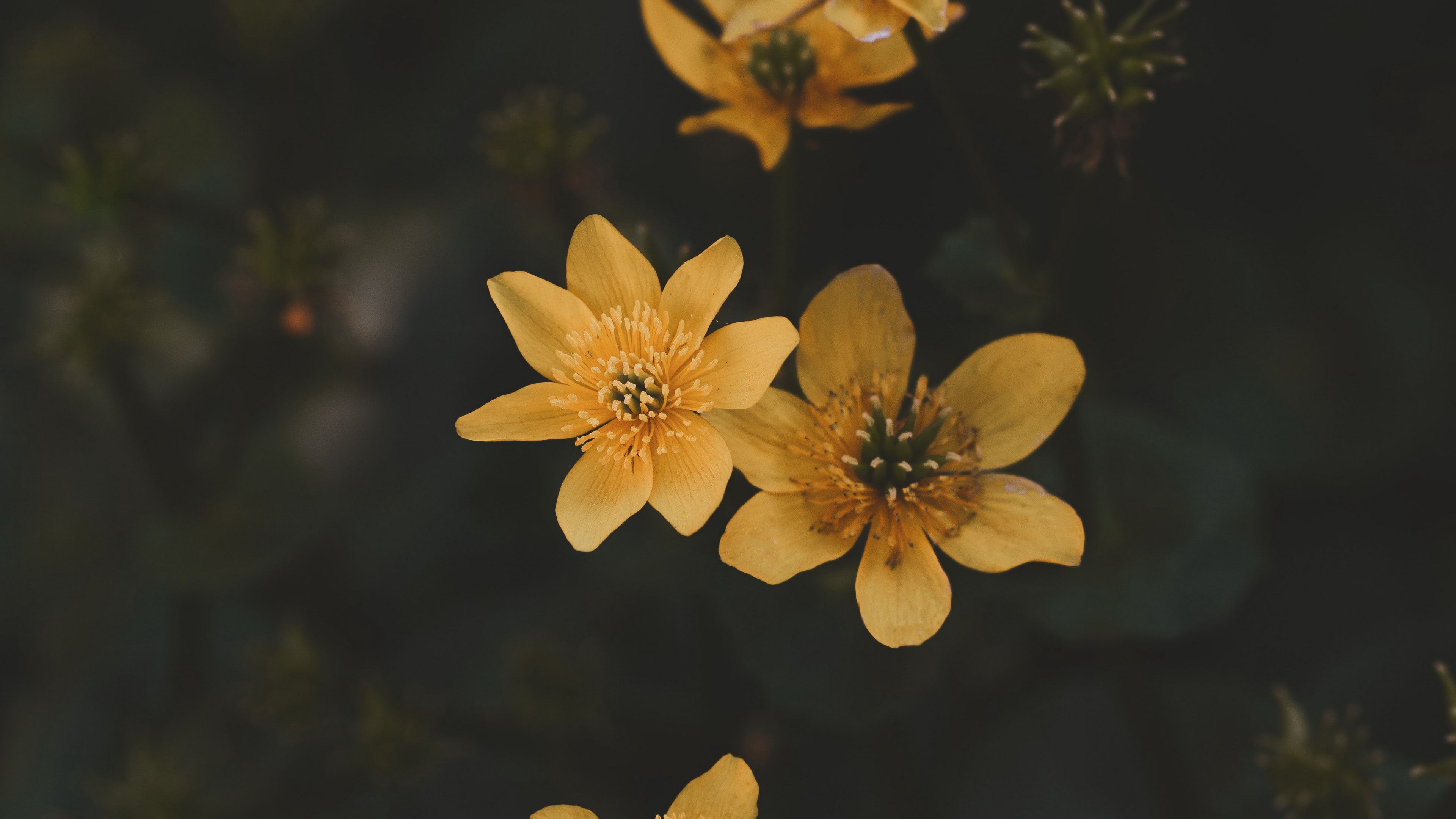 Description: A group of yellow flowers with green leaves in the background and a dark background with a few yellow flowers.
