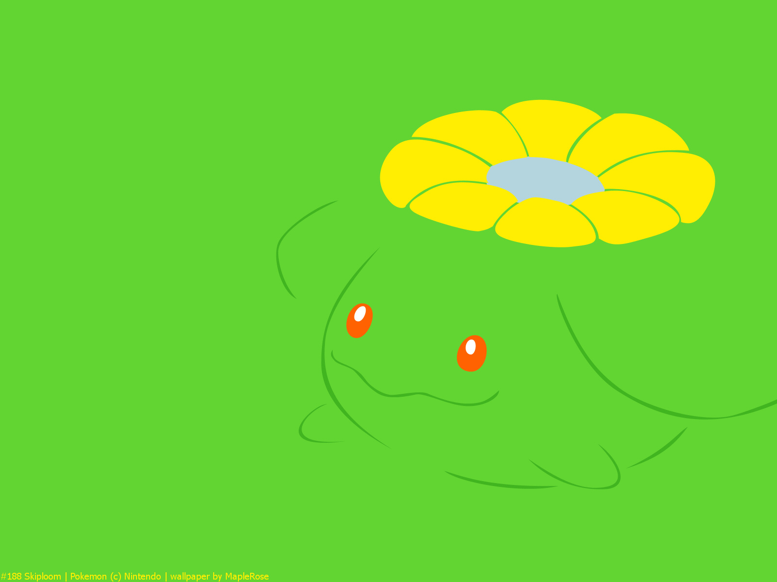 Description: A drawing of a yellow flower with red eyes on a green background with a blue sky in the background.