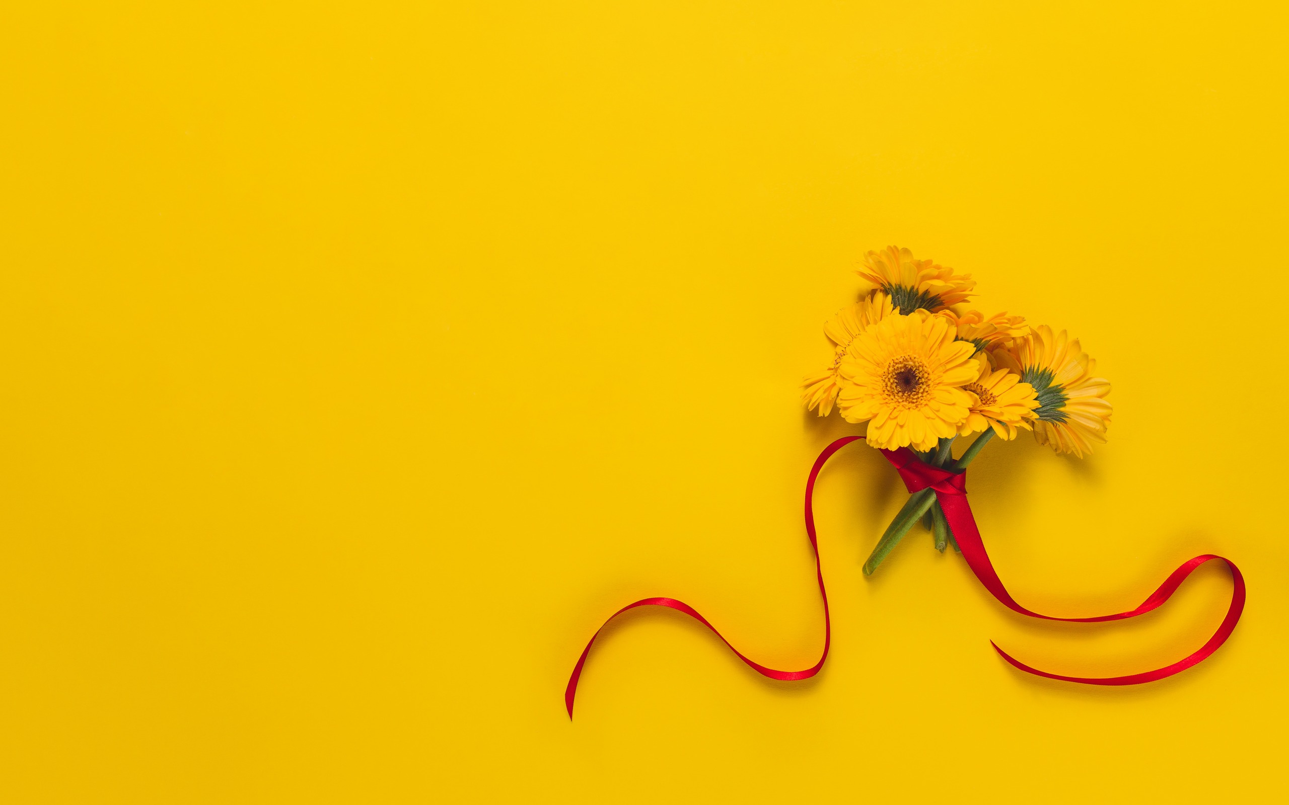 Description: A bunch of yellow flowers with a red ribbon on a yellow background with a red bow on the end.