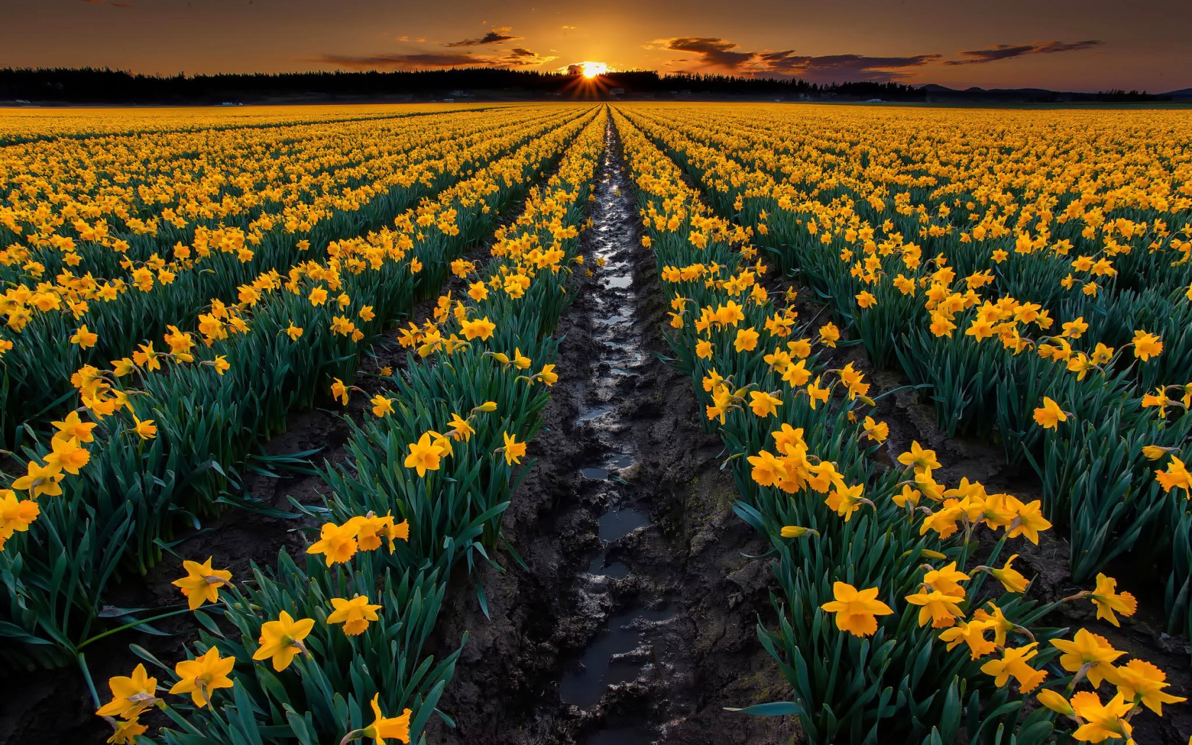Description: A field of yellow flowers with the sun setting in the background and a dark sky in the background with clouds.