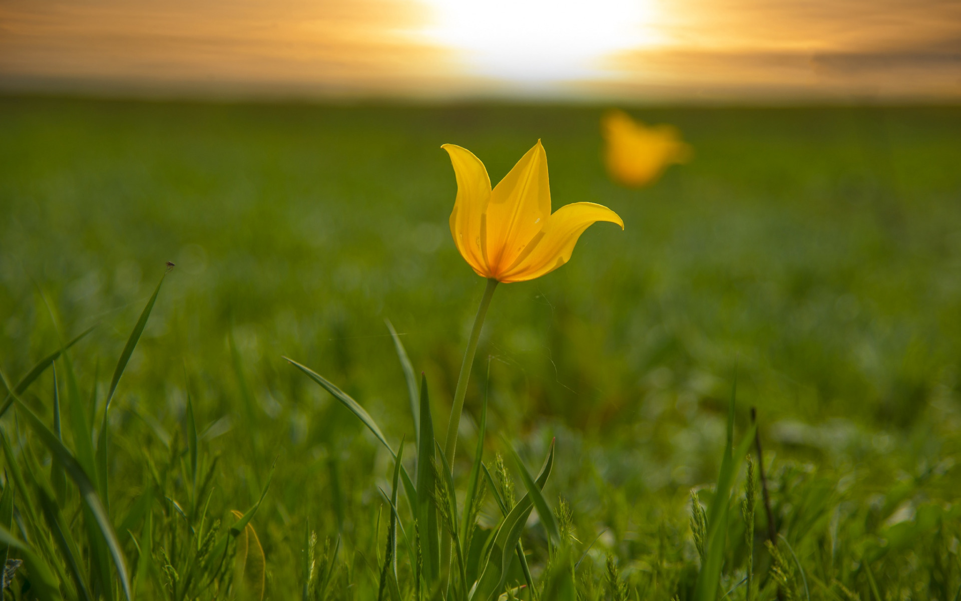 Description: A field with grass and a single yellow flower in the foreground and a sunset in the background with a few clouds.