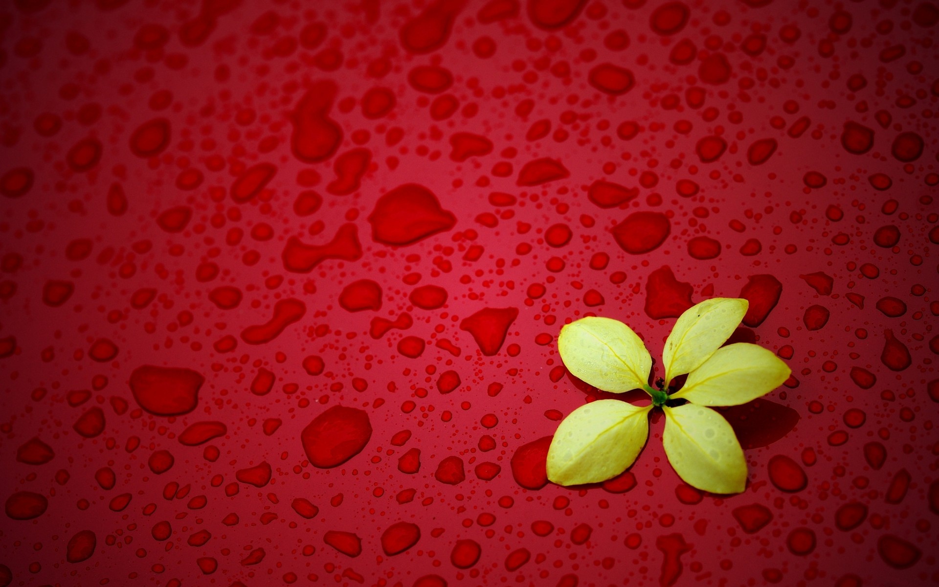 Description: A yellow flower on a red background with drops of water on it and a red background with hearts on it.