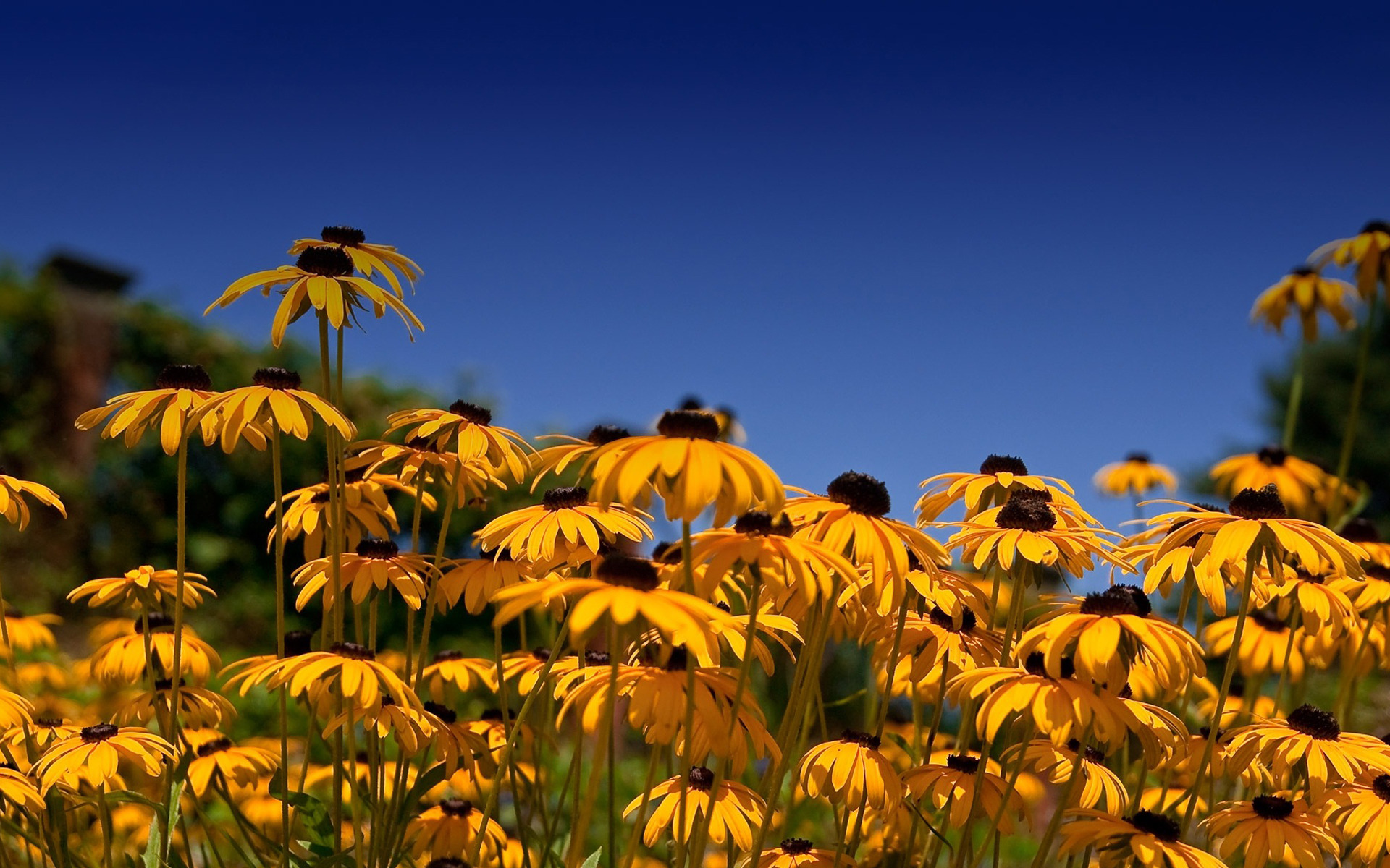 Description: A field of yellow flowers with a blue sky in the background and a few trees in the background with a few leaves.