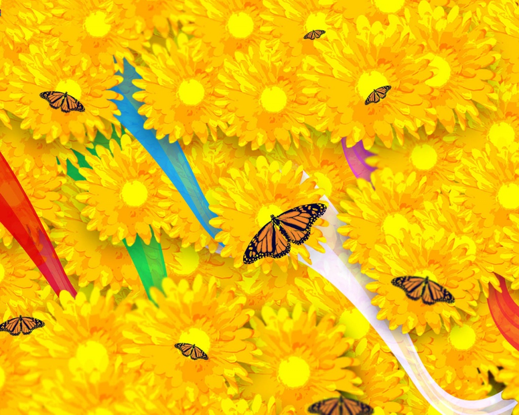 Description: A bunch of yellow flowers with butterflies on them and a white tube in the middle of the picture with a red ribbon.