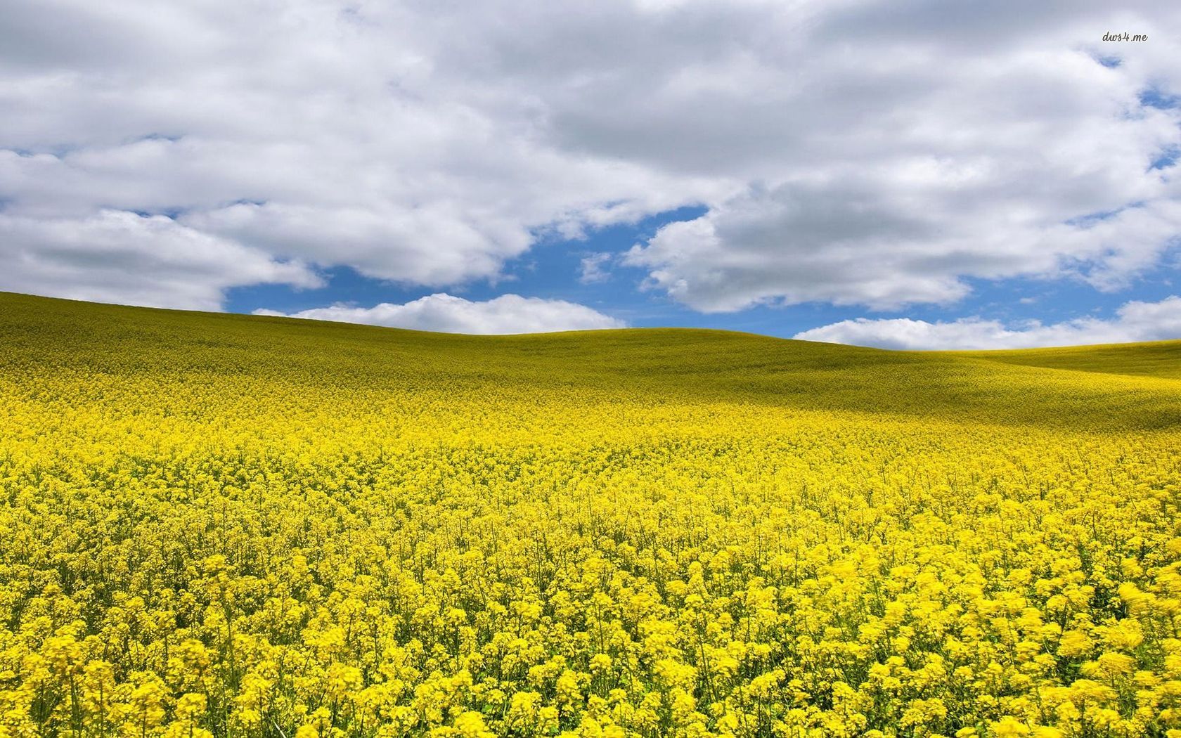 Description: A field of yellow flowers under a cloudy sky with a blue sky in the background and a few clouds in the sky.