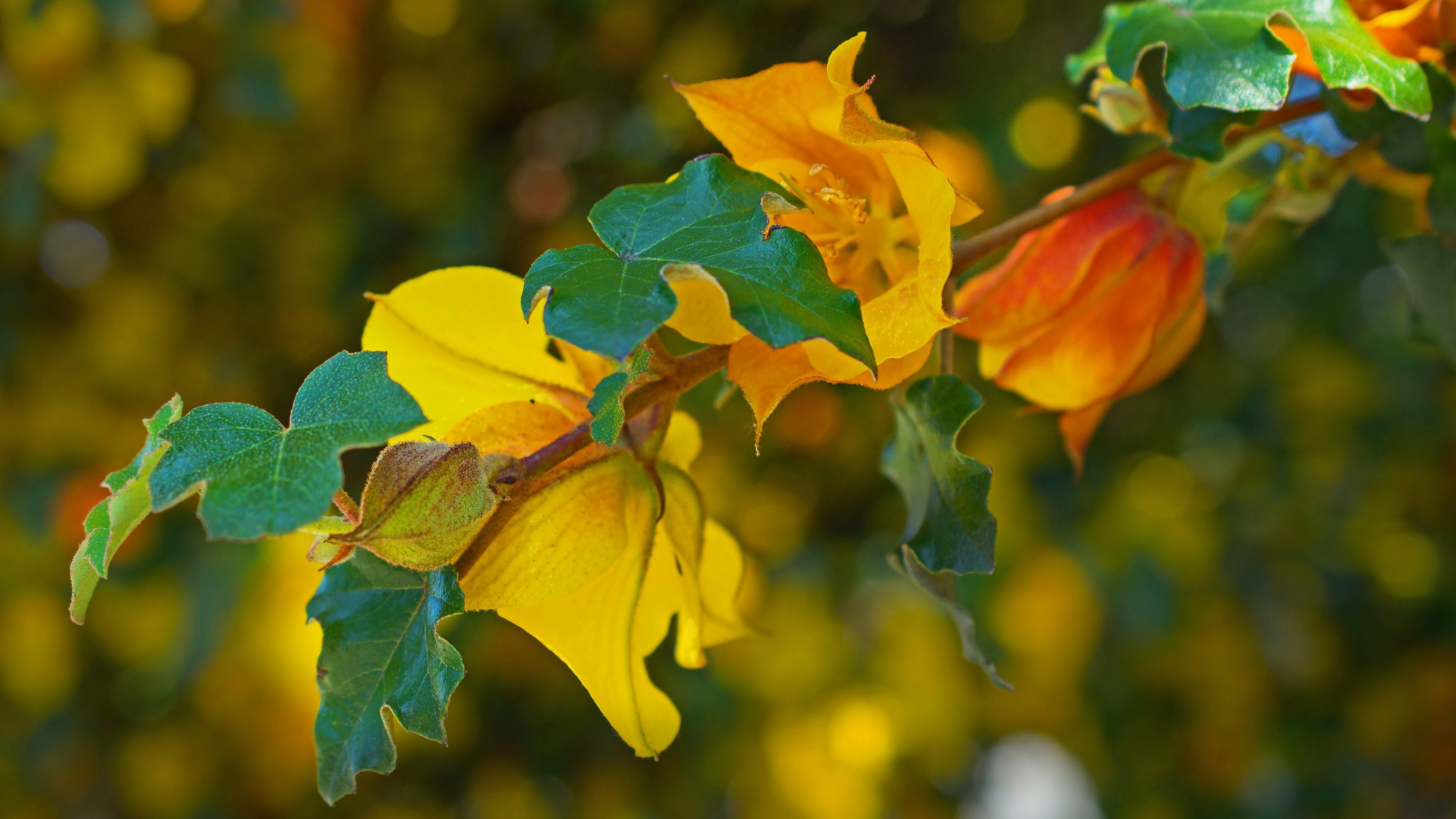 Description: A branch with yellow flowers and green leaves on it's branches.