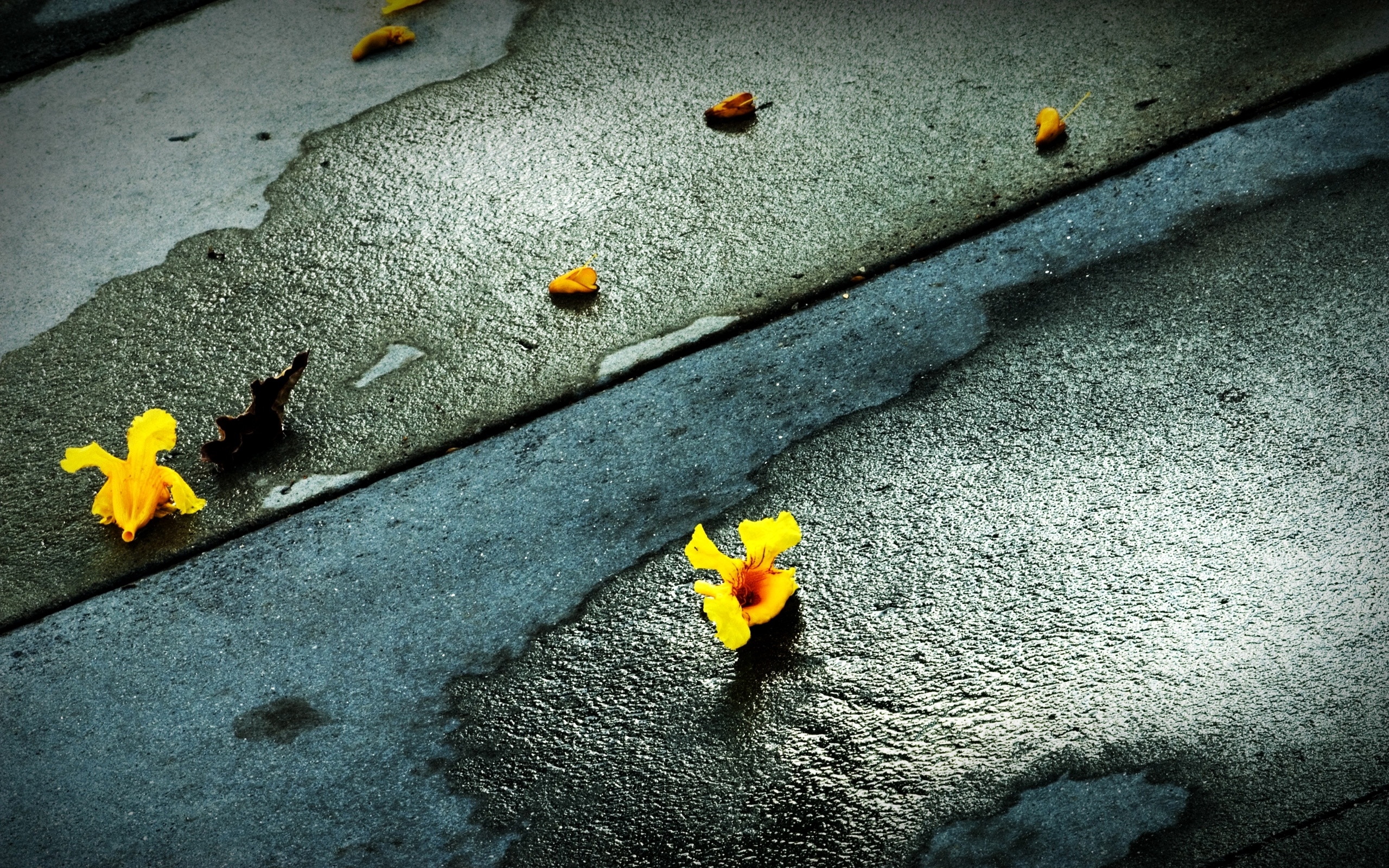 Description: A couple of yellow flowers sitting on the side of a road next to a puddle of water and a sidewalk.