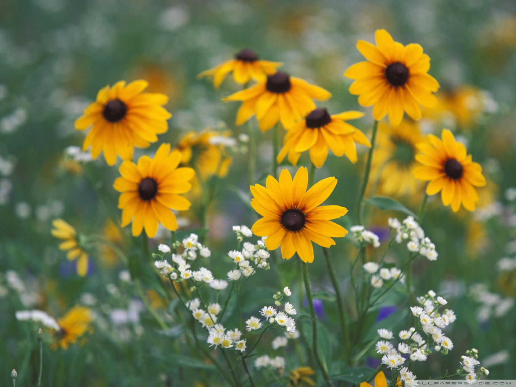 Description: A field of yellow flowers with white flowers in the foreground and a green field in the background with blue flowers.