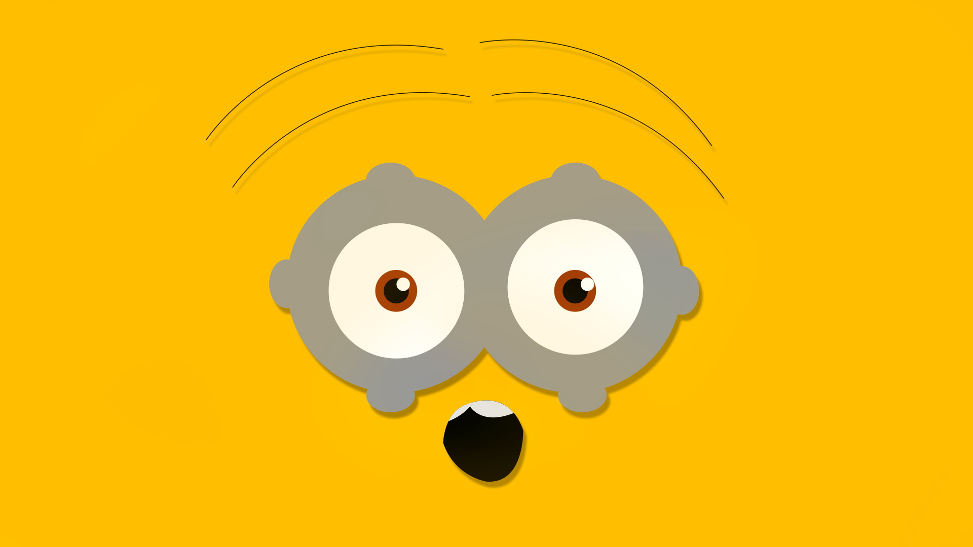 Description: A yellow background with a gray face and eyes with a black nose and a black nose with two brown eyes.