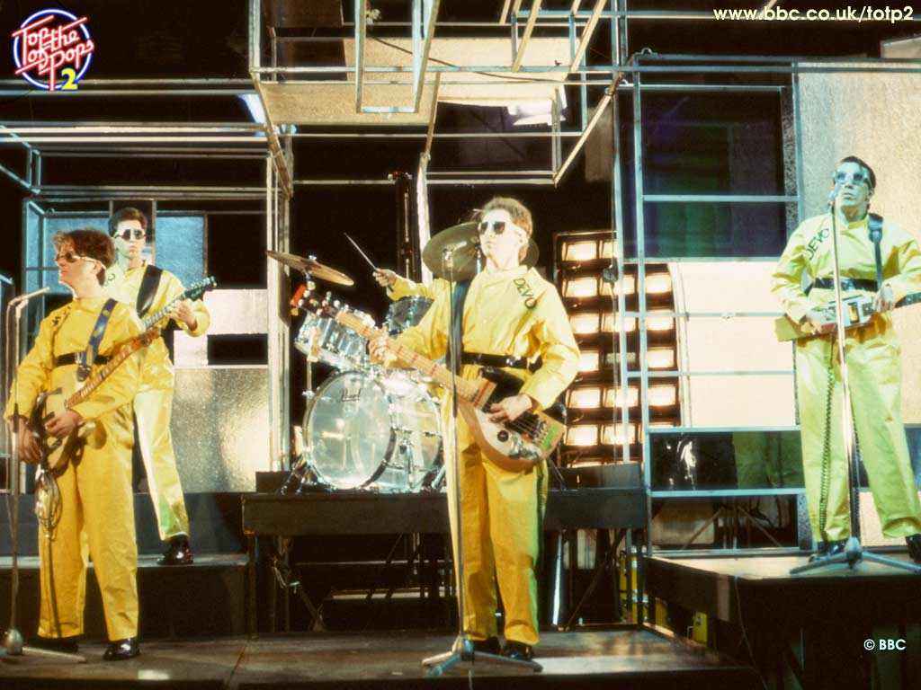 Description: A group of men in yellow outfits on stage with guitars and drums in front of them and a microphone.