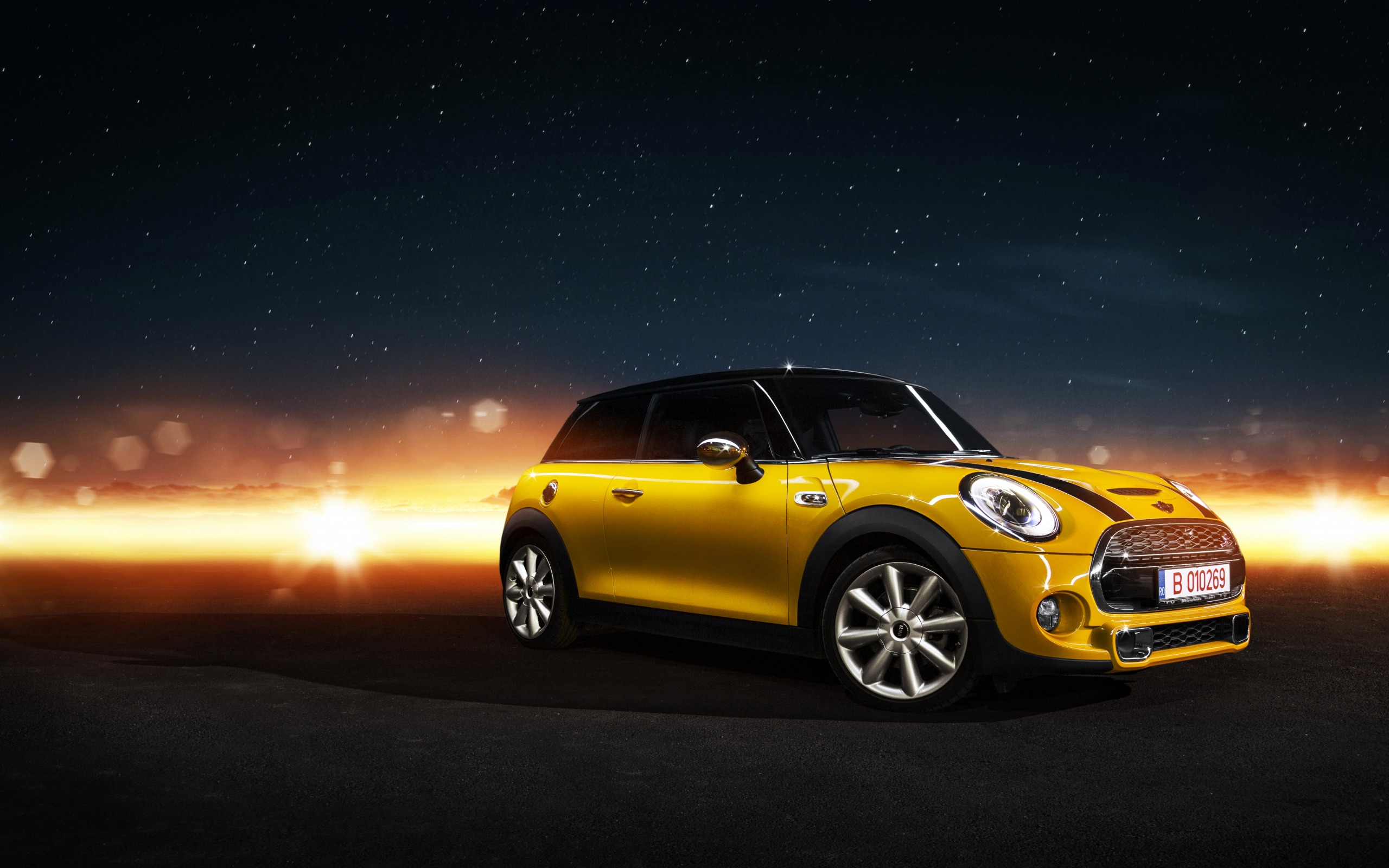 Description: A yellow mini cooper parked in a dark space with stars in the background and a bright light behind it.
