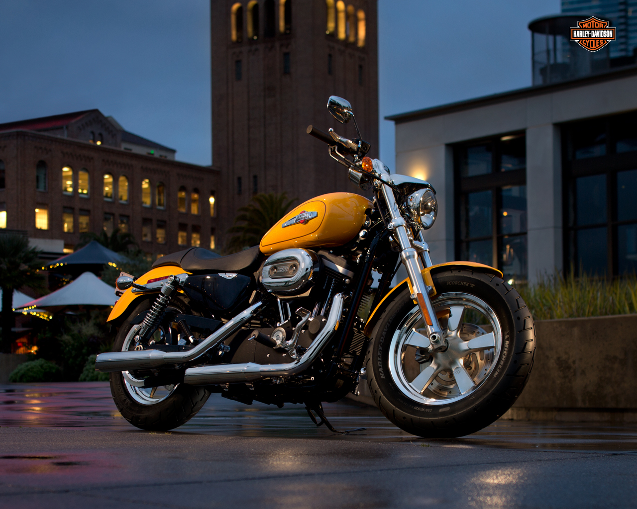 Description: A yellow motorcycle parked in front of a building at night with a clock tower in the background at dusk.
