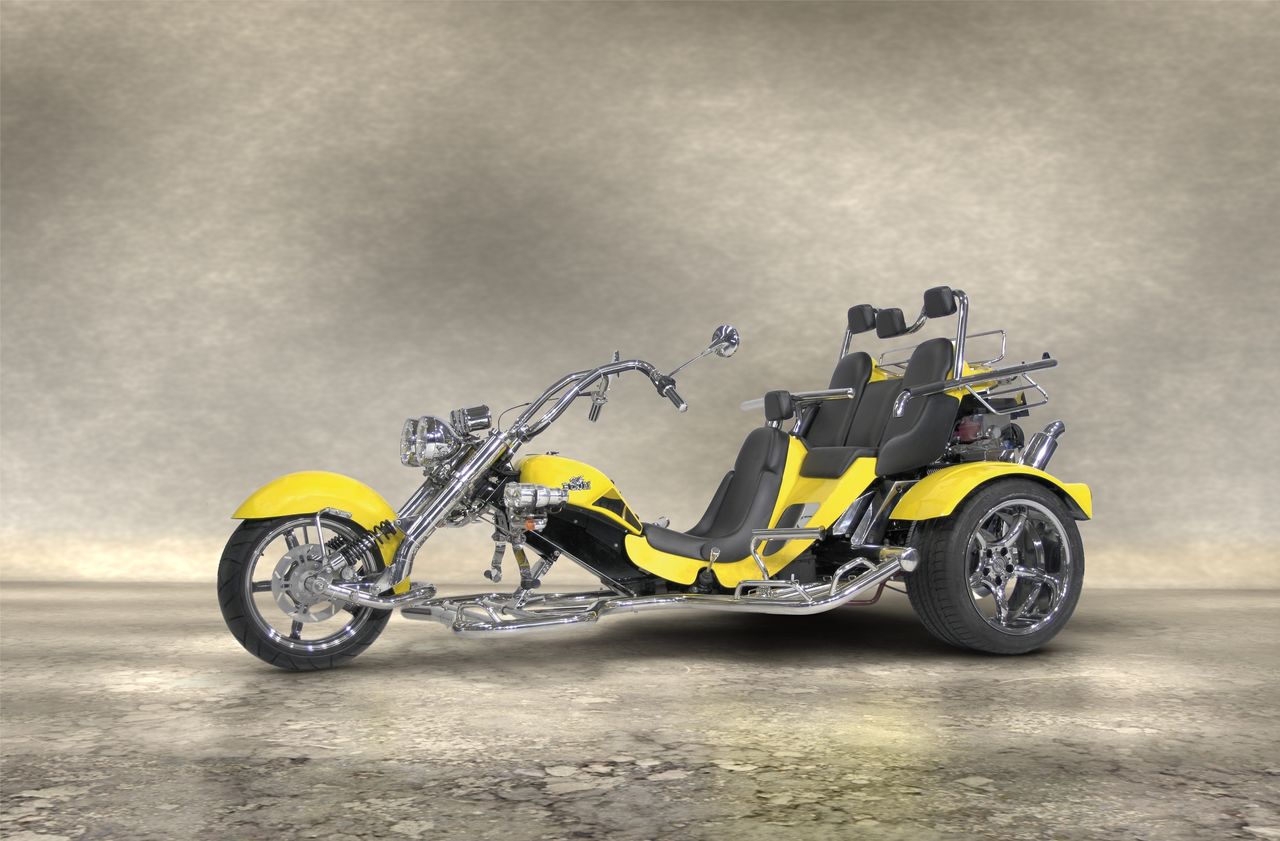 Description: A yellow motorcycle with a side car on a gray background with a black seat and a black seat on the back.