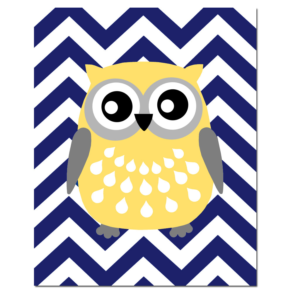 Description: A yellow owl with big eyes sitting on a blue and white chevron background with rain drops on its eyes.