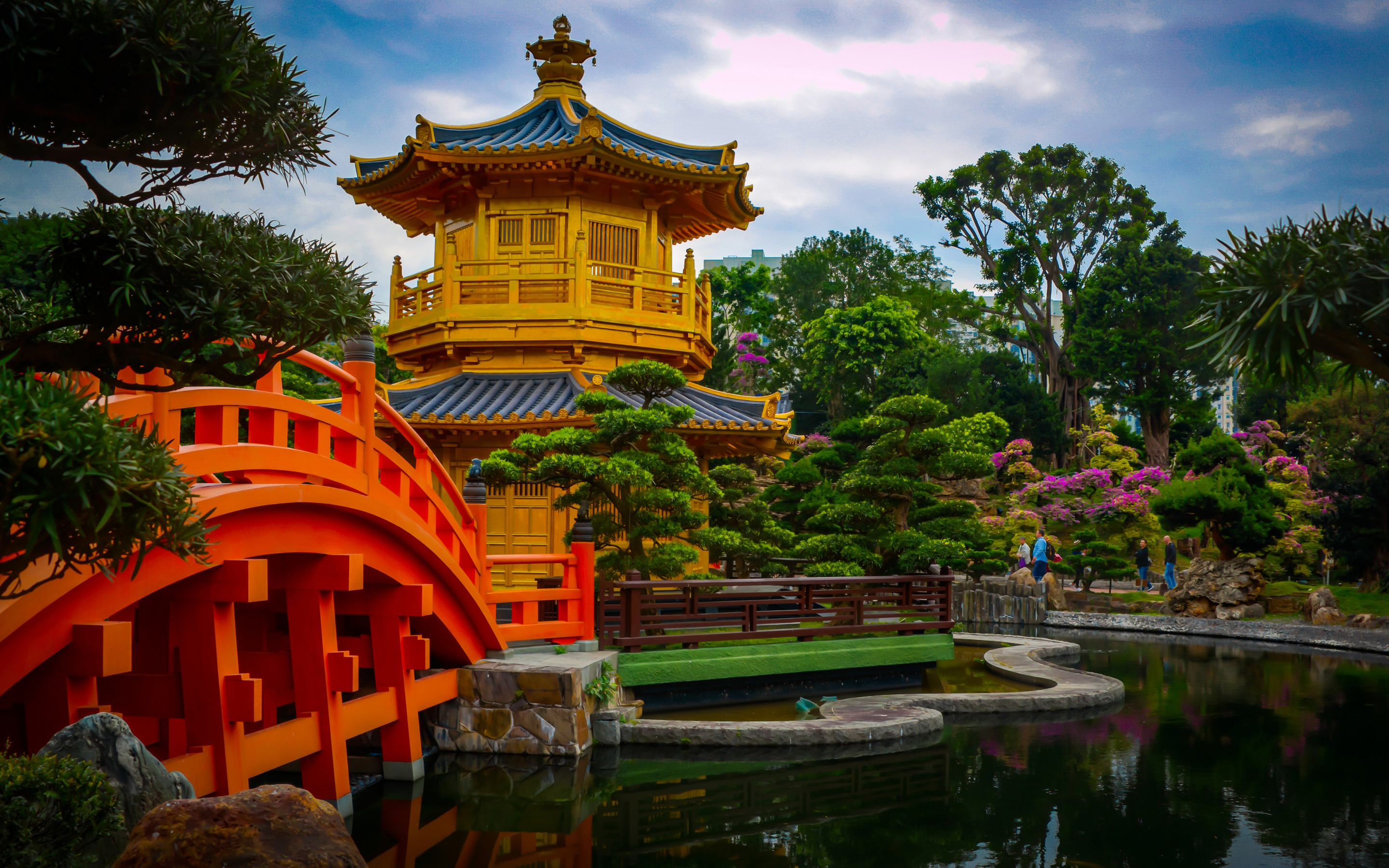 Description: A yellow pagoda stands over a pond in a garden with a bridge and a bridge over it.