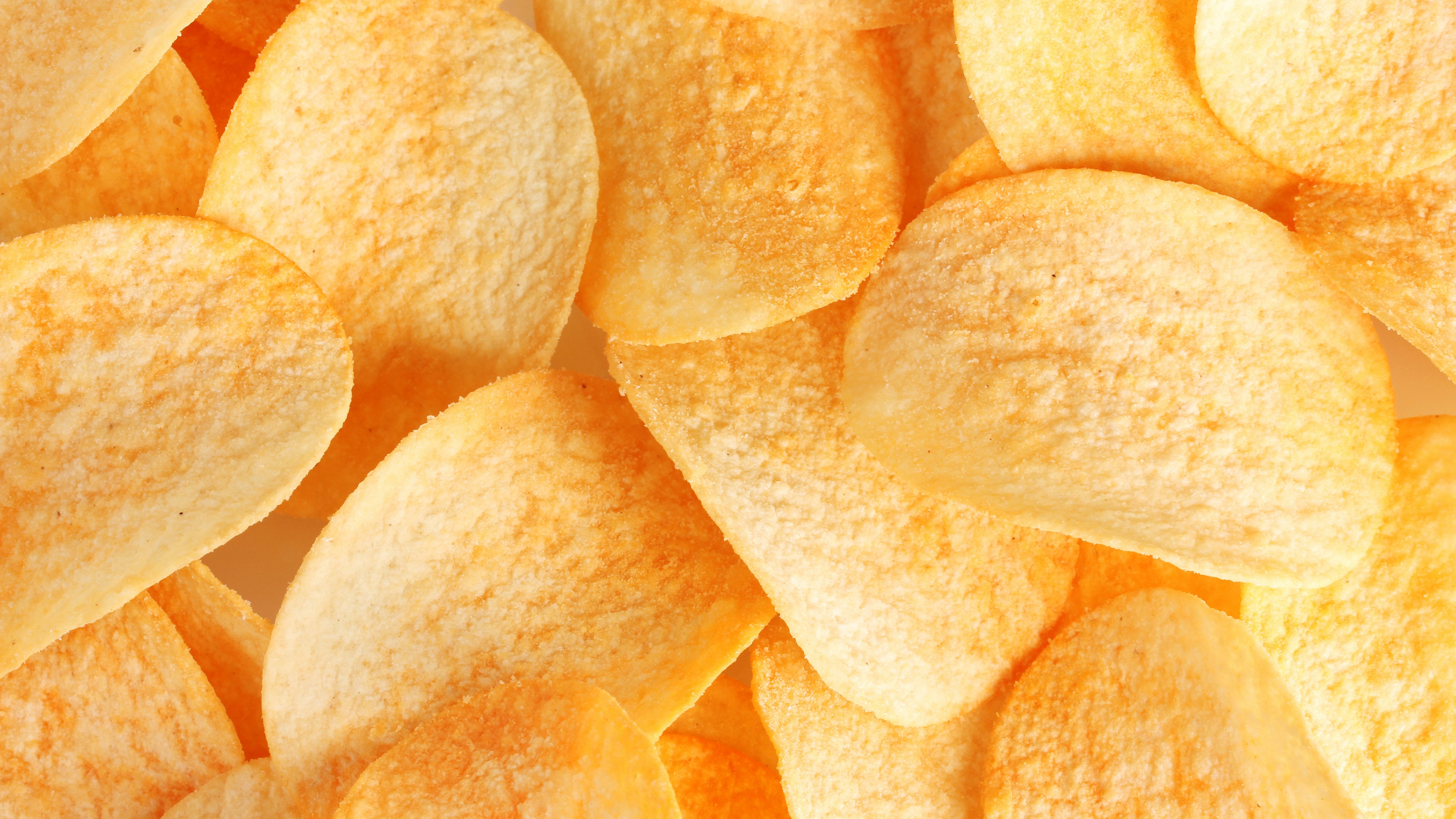 Description: A pile of yellow potato chips on a white surface with a yellow background and a white border around the edges.