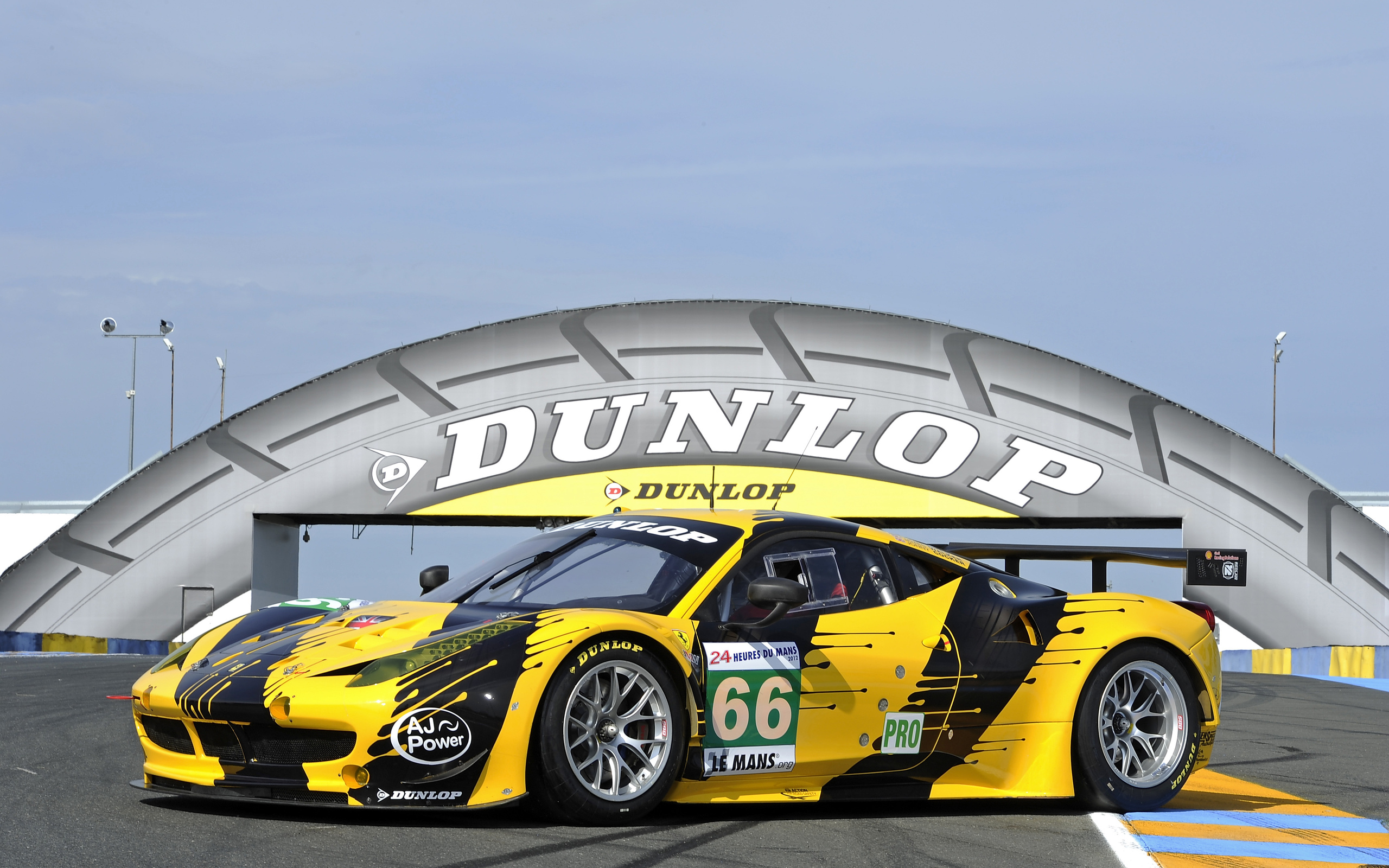Description: A yellow race car driving down a race track under a tunnel of tires that reads dunlop on the side.
