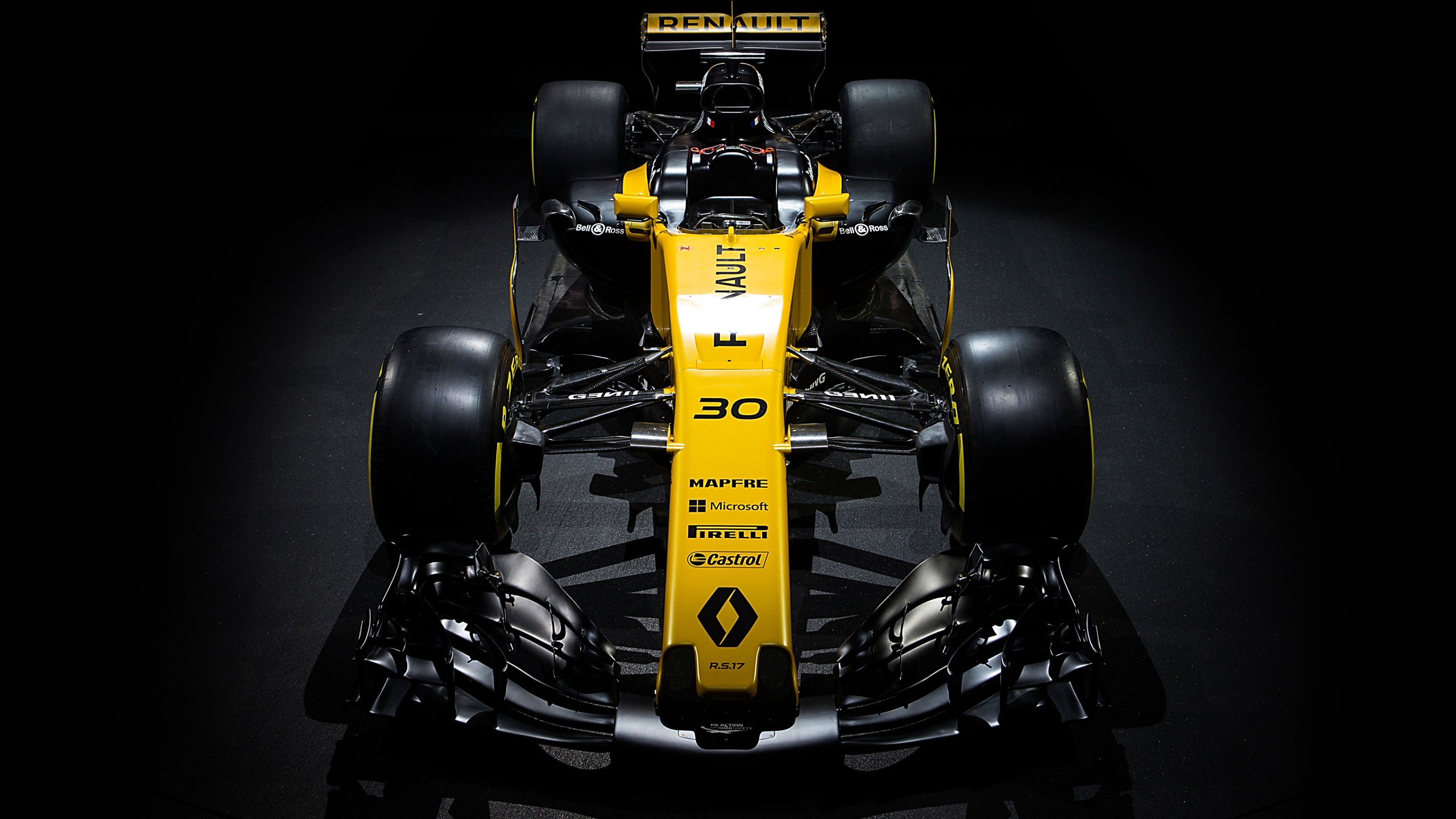 Description: A yellow race car is shown in a dark room with a black background and a black floor and a black background.