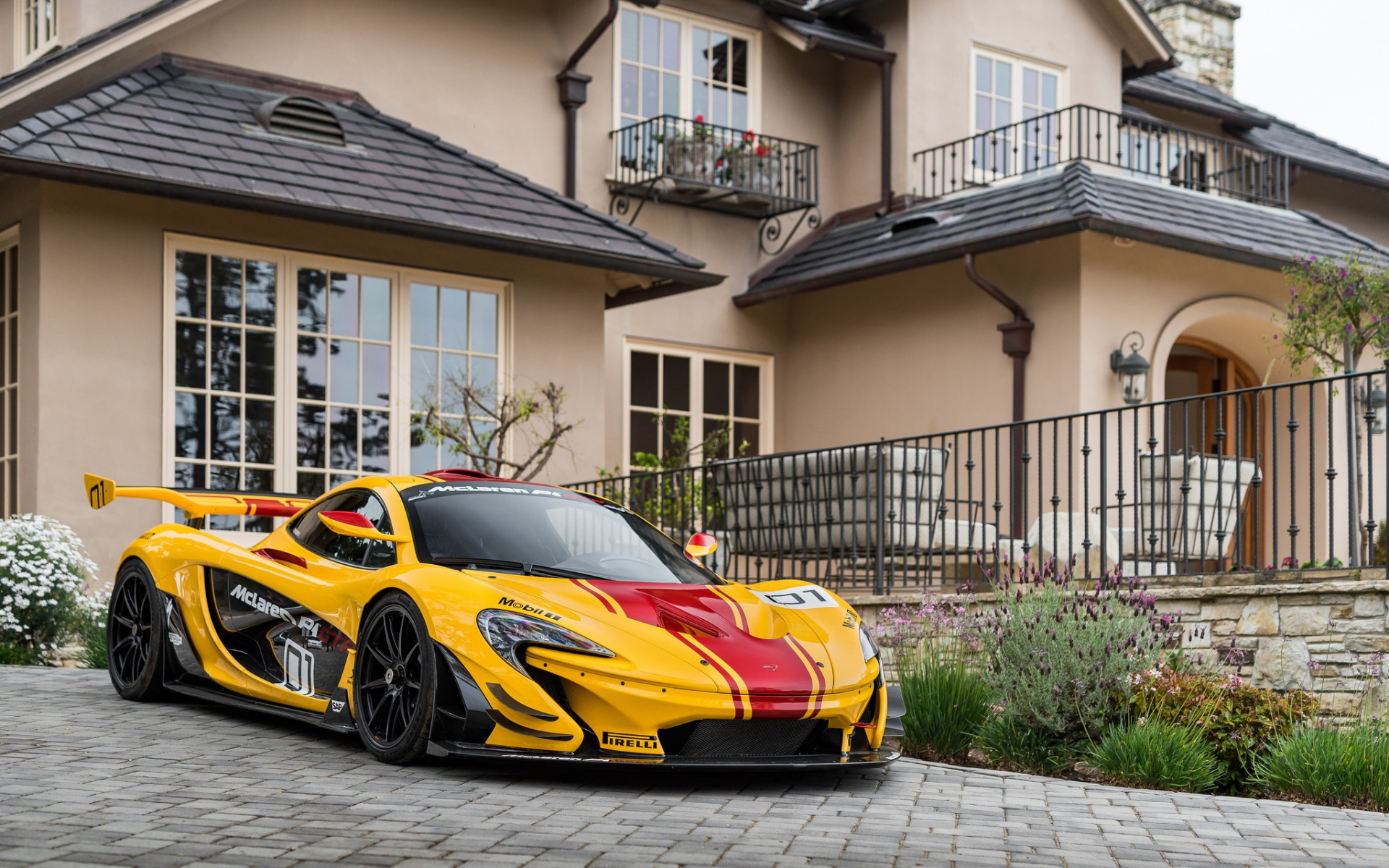 Description: A yellow and red sports car parked in front of a house with a black roof and a fence in front of it.