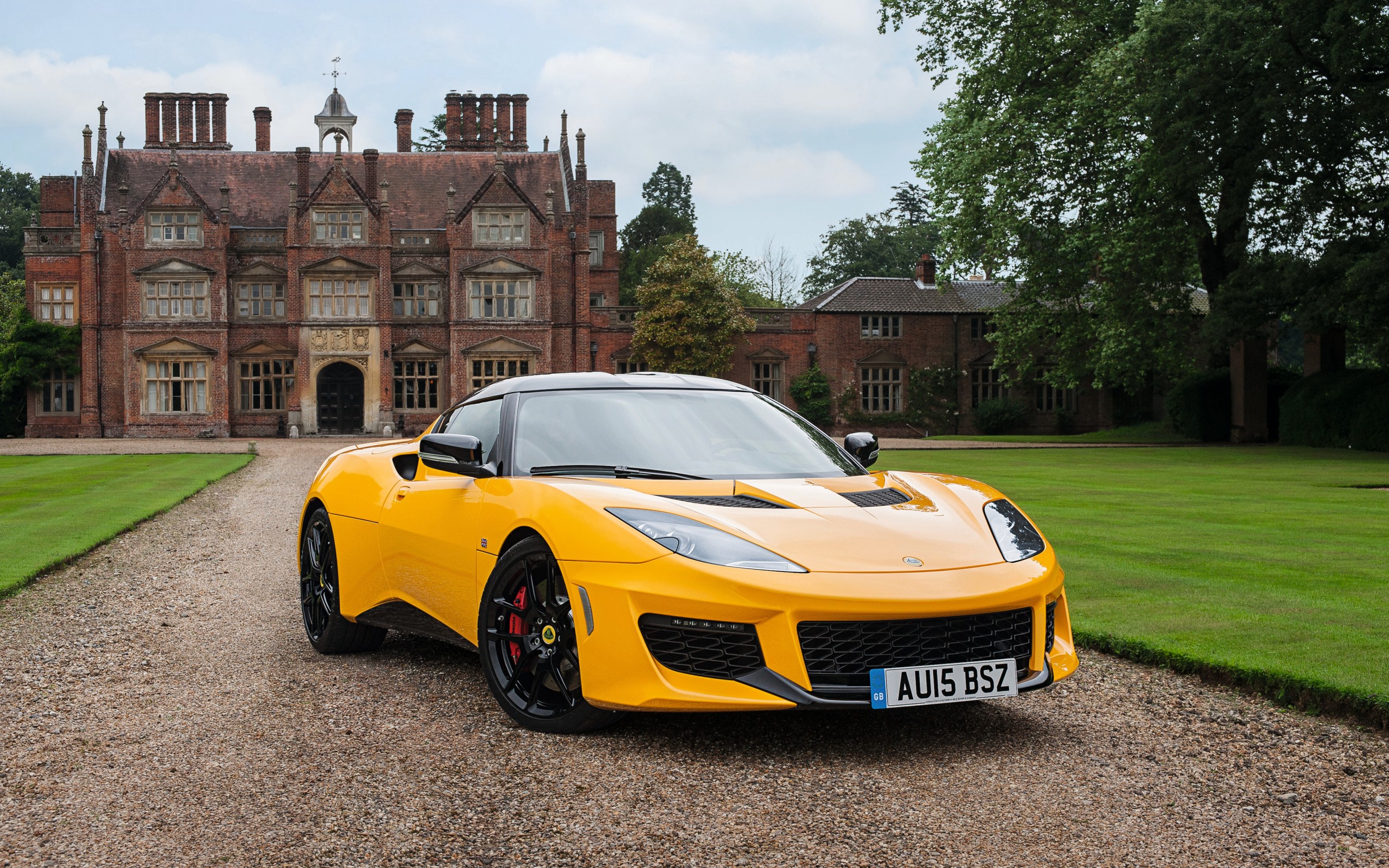 Description: A yellow sports car parked in front of a large building with a driveway and grass area in front of it.