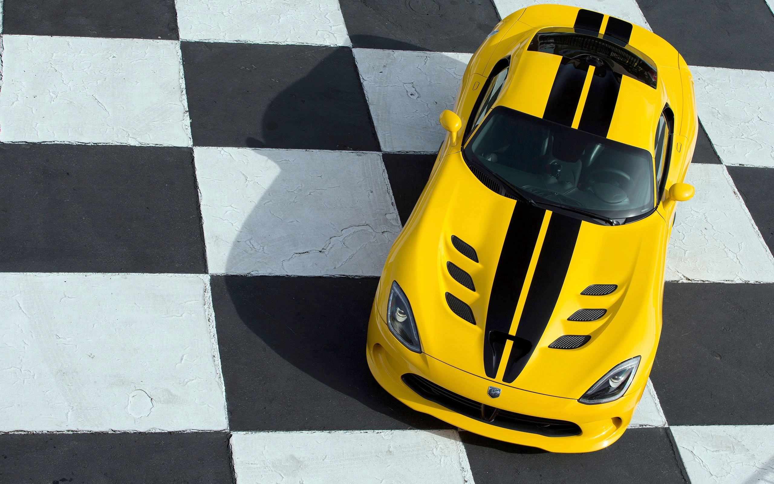 Description: A yellow sports car is parked on a checkered floor with a black stripe on the hood and hood.