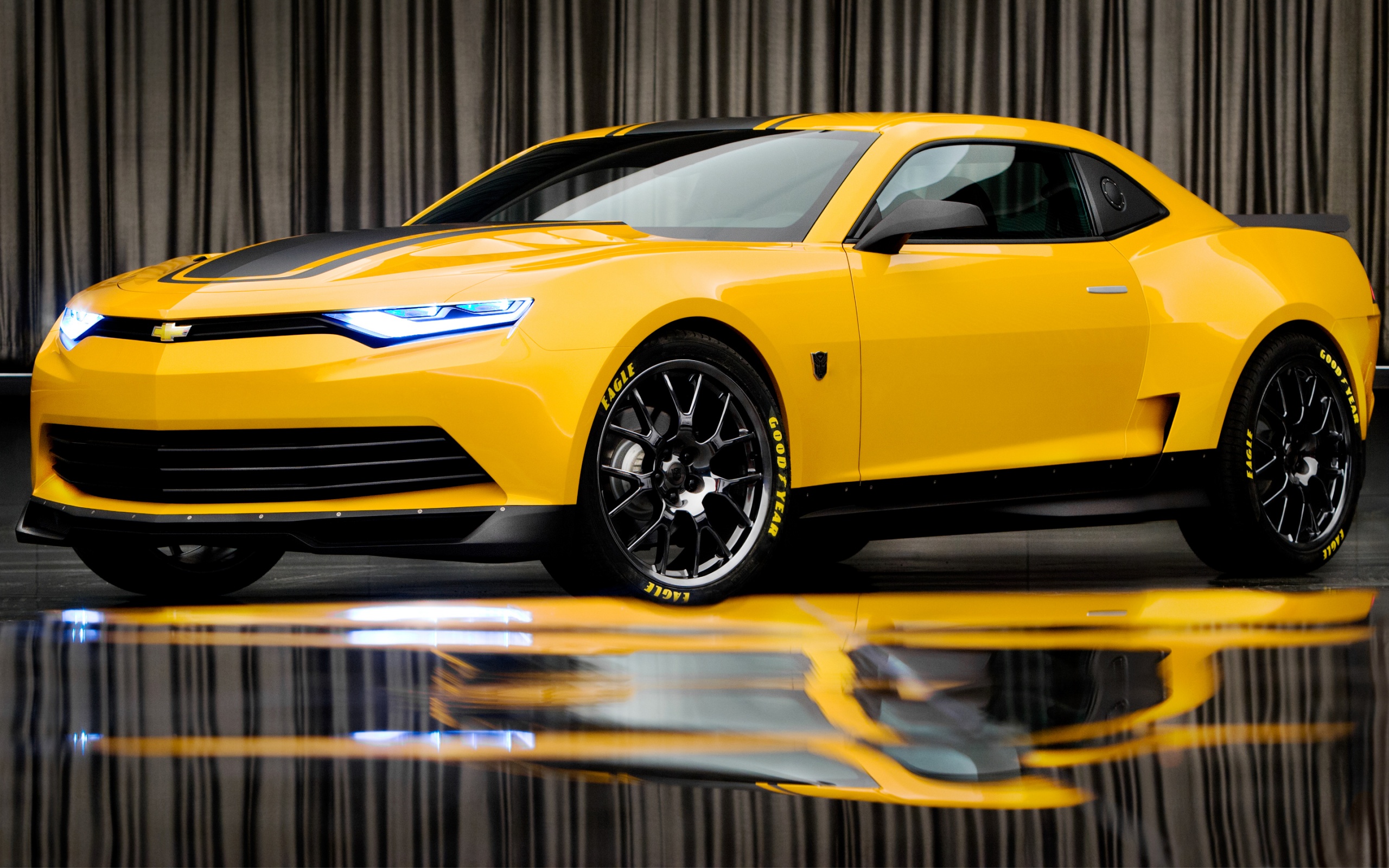 Description: A yellow sports car is parked in a garage with a black stripe on the floor and a black and white stripe on the wall.