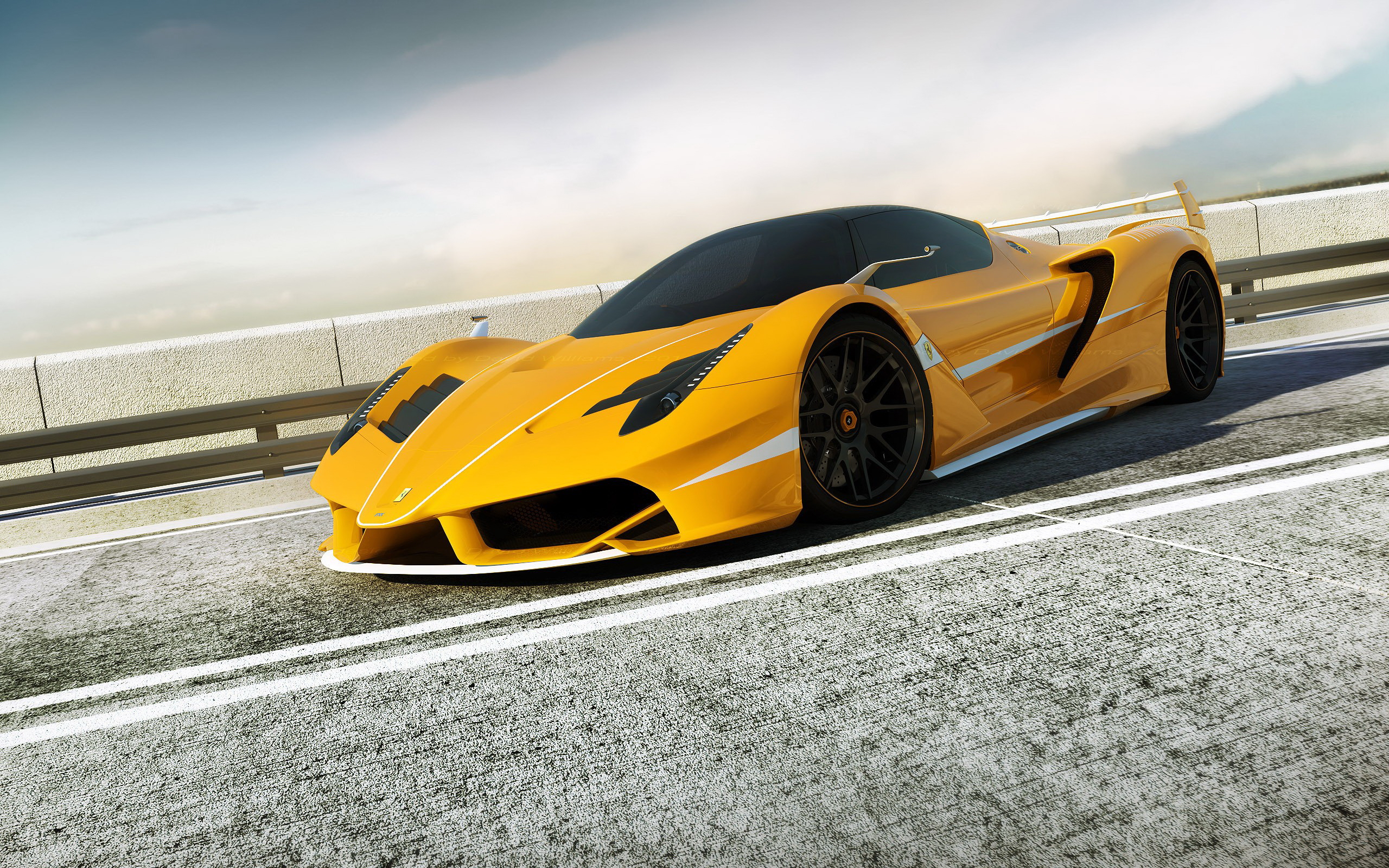Description: A yellow sports car driving down a highway next to a bridge and a fenced in area with a fence.