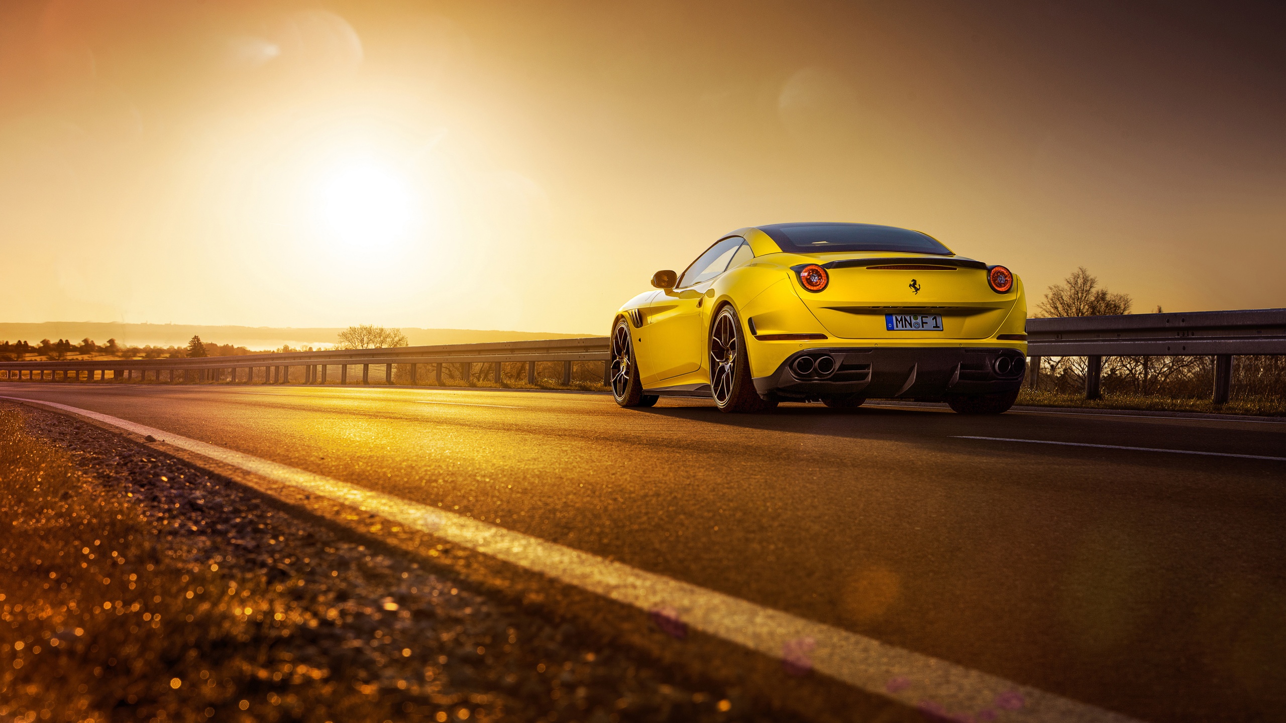 Description: A yellow sports car driving down a highway at sunset or dawn with the sun shining on the horizon behind it.