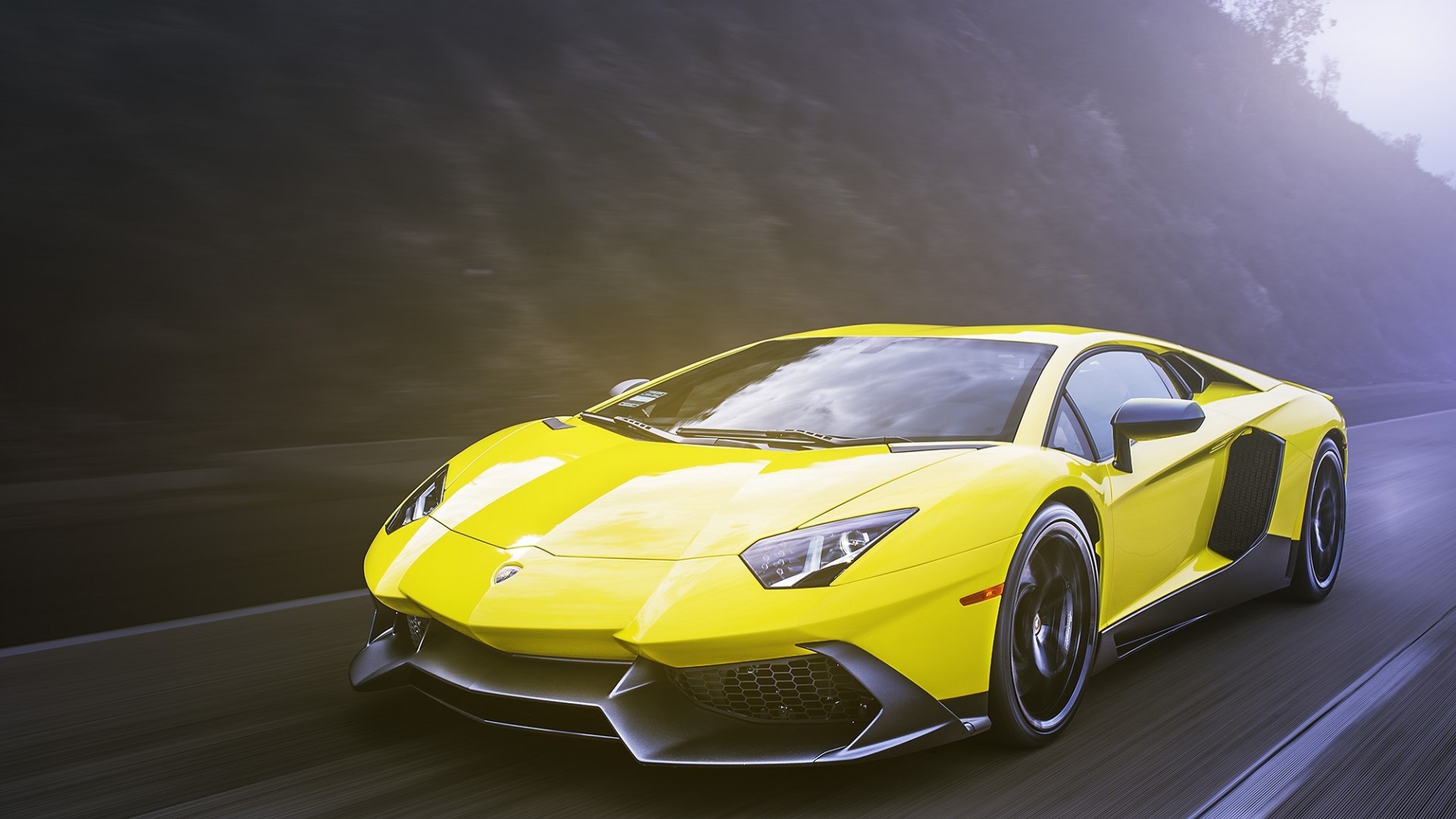 Description: A yellow sports car driving down a road in the dark night time with fog on the ground and trees in the background.