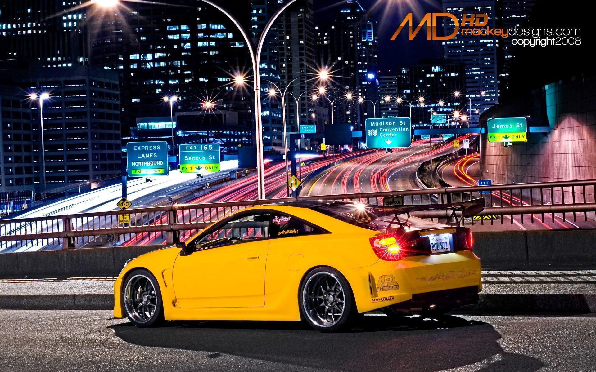 Description: A yellow sports car parked on the side of a road at night with city lights in the background and a city street.