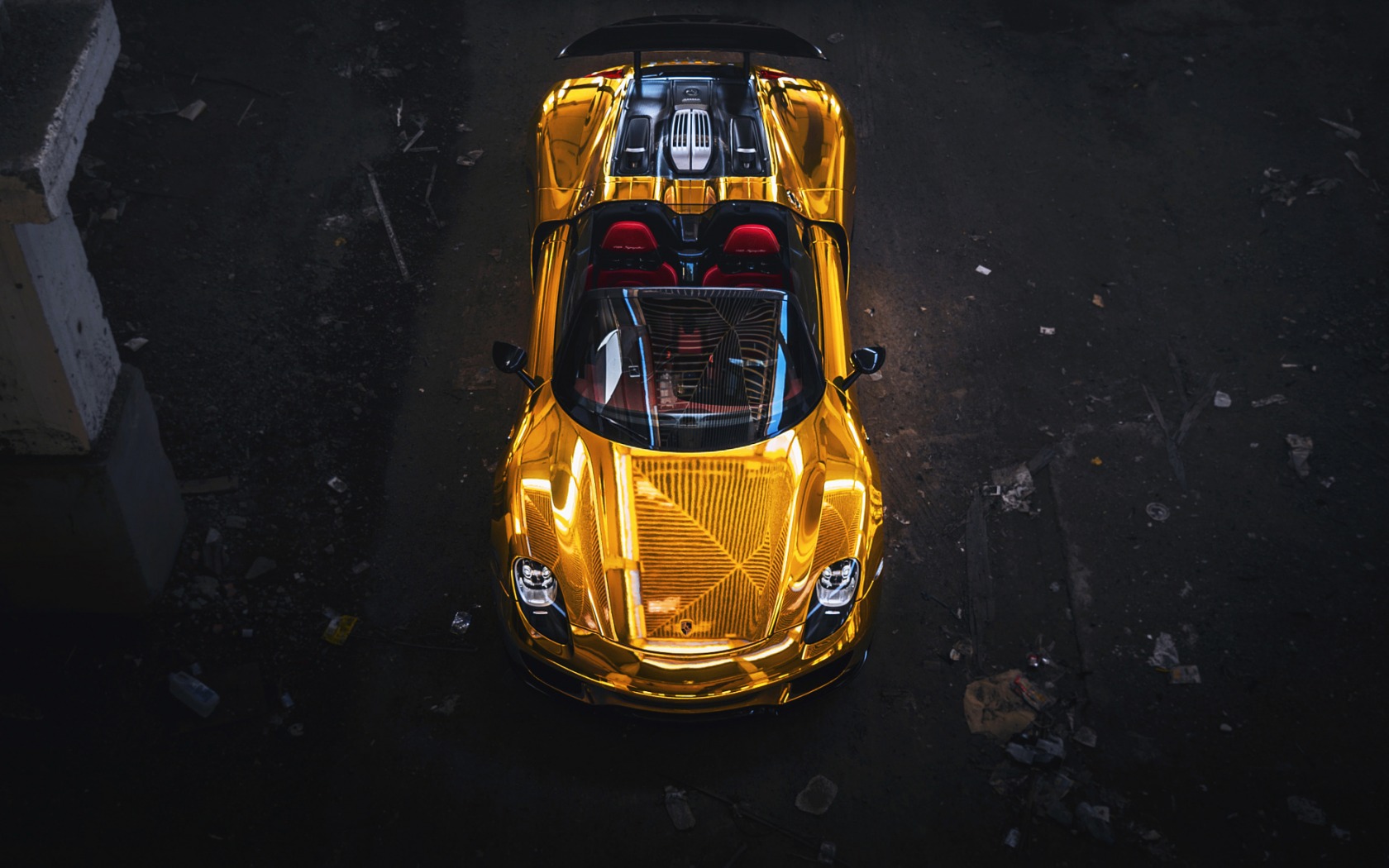 Description: A yellow sports car parked in a parking lot with its hood up and the hood up open and the hood down.