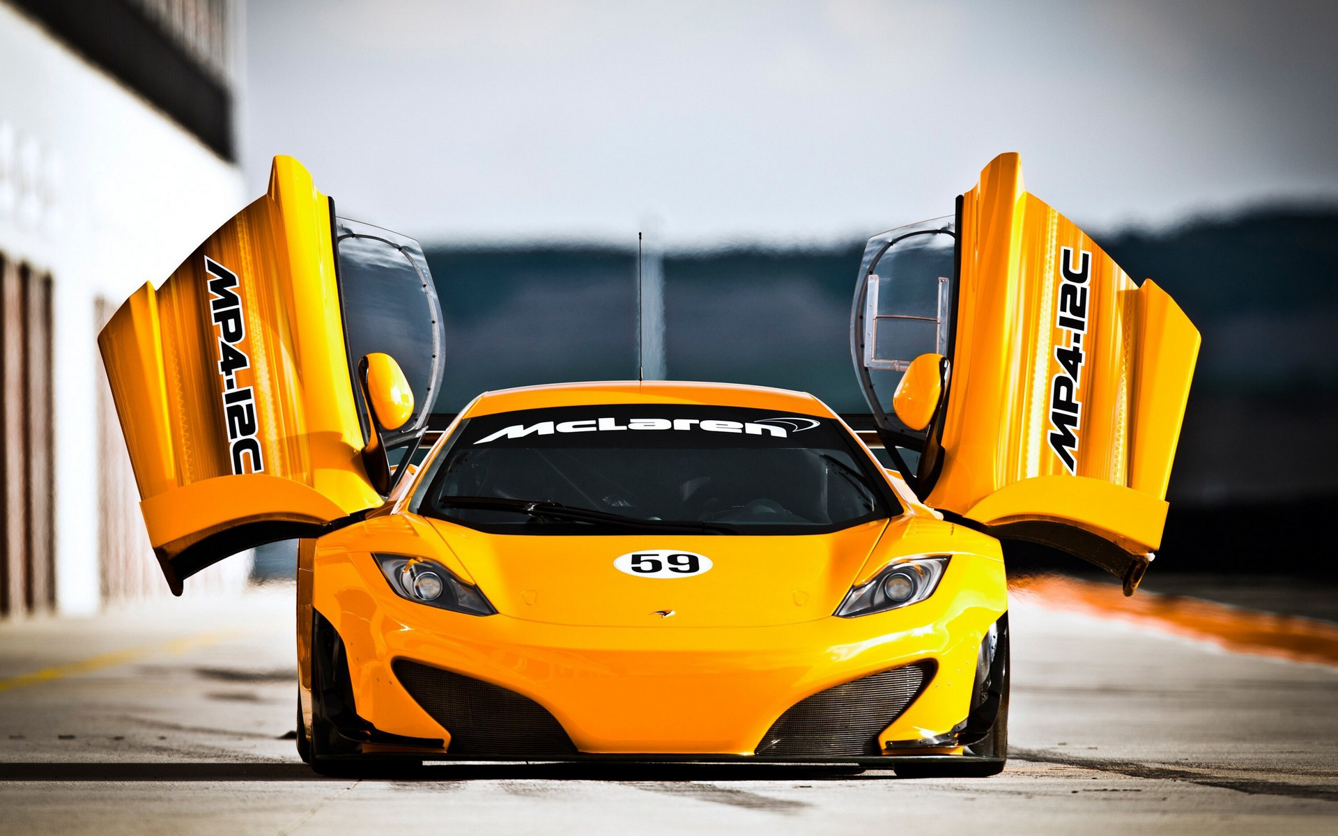 Description: A yellow sports car with its doors open on a road with a building in the background and a sky background.