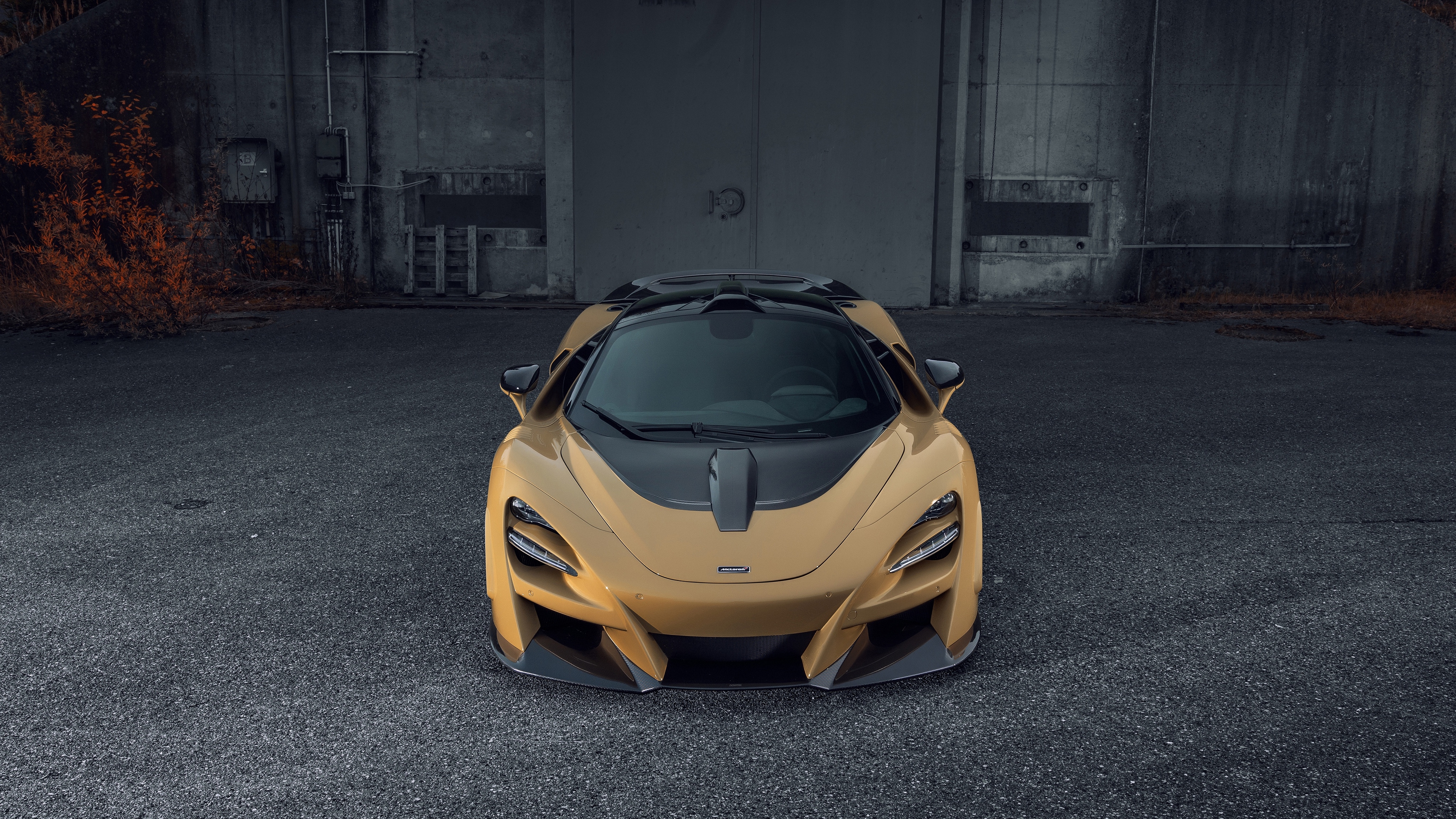 Description: A yellow sports car parked in a parking lot next to a building with a door open and a window.