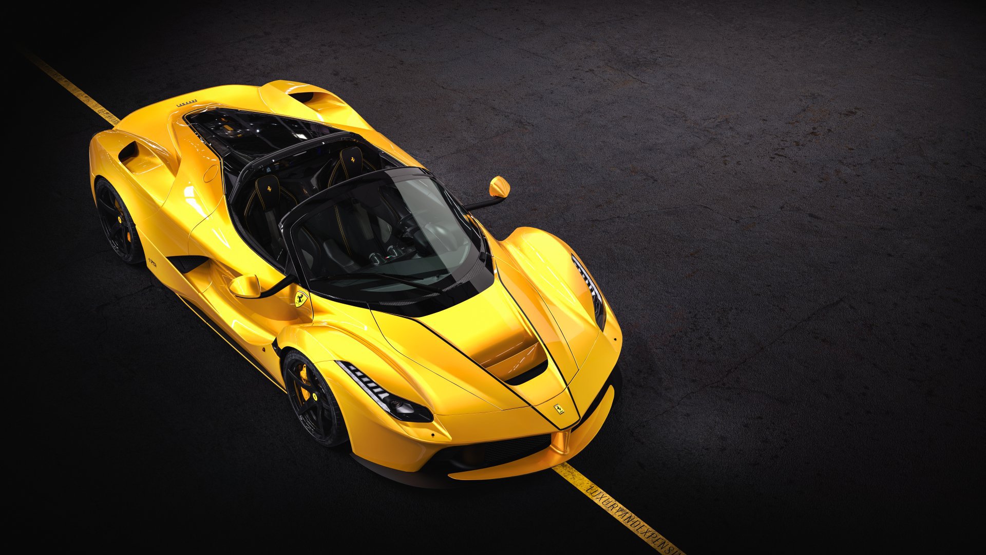 Description: A yellow sports car parked on a parking lot next to a yellow pole and a black background with a yellow line.