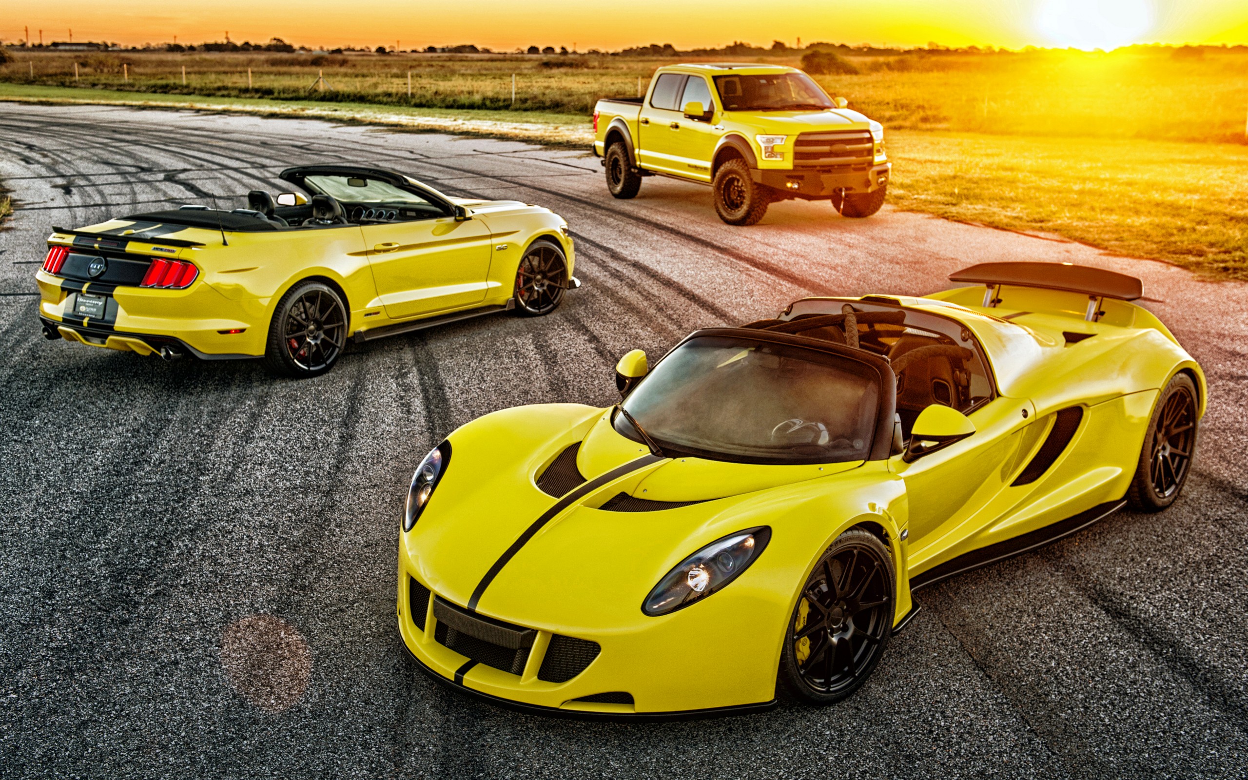 Description: Two yellow sports cars driving down a race track at sunset or sunrise or sunset.